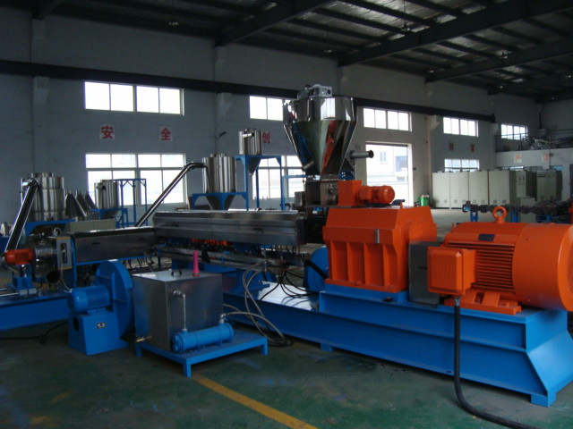 三、电缆料造粒机基本结构形式:特点:将双螺杆高速,强混炼与单螺杆低速,低温,电缆料造粒机 弱剪切特性相结合,电缆料造粒机扬长避短,是当今热敏性,剪敏性物料高效配混改性的机组。适用于:电缆料造粒机PVC电缆料,鞋底料,透明瓶料,医用料,低烟无卤或无卤阻燃电缆料,EVA屏蔽料,PE/EVA炭黑母粒等各种交联电缆料,辐照交联电缆料的生产。电缆料造粒机双阶式造粒机组上阶为YS型高速同向双螺杆挤出机,电缆料造粒机 下阶为系列单螺杆挤出机,构成双阶式复合机组,物料经双螺杆进入单螺杆,后经单螺杆挤出后切成颗粒,使用对吹式不锈钢热切罩经低噪音风机让物料在不锈钢管道送到旋风分离器内,经过两级旋风分离器到振动筛,使用振动筛把粘粒的、粉末的物料筛出来,取成品后用风机直接把物料进打包料仓,彻底让物料进行冷却,整个生产工艺操作完毕