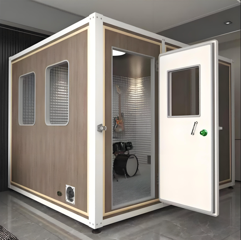解决钢琴的噪声,须采用房中房处理,除房中房地面用减震材料与楼层地面有连接以外,其余的5个双层墙面,都不与楼体相连,即形成与原结构无任何刚性连接的内胆式房间。根据我们完成过的类似隔声处理工程经验及检测数据,隔声量可达到70dB-75dB。对于架子鼓噪声,钢琴噪声,大约90-100dB(A)左右,传到邻居的噪声将不超过45dB(A),隔声效果令人满意的。