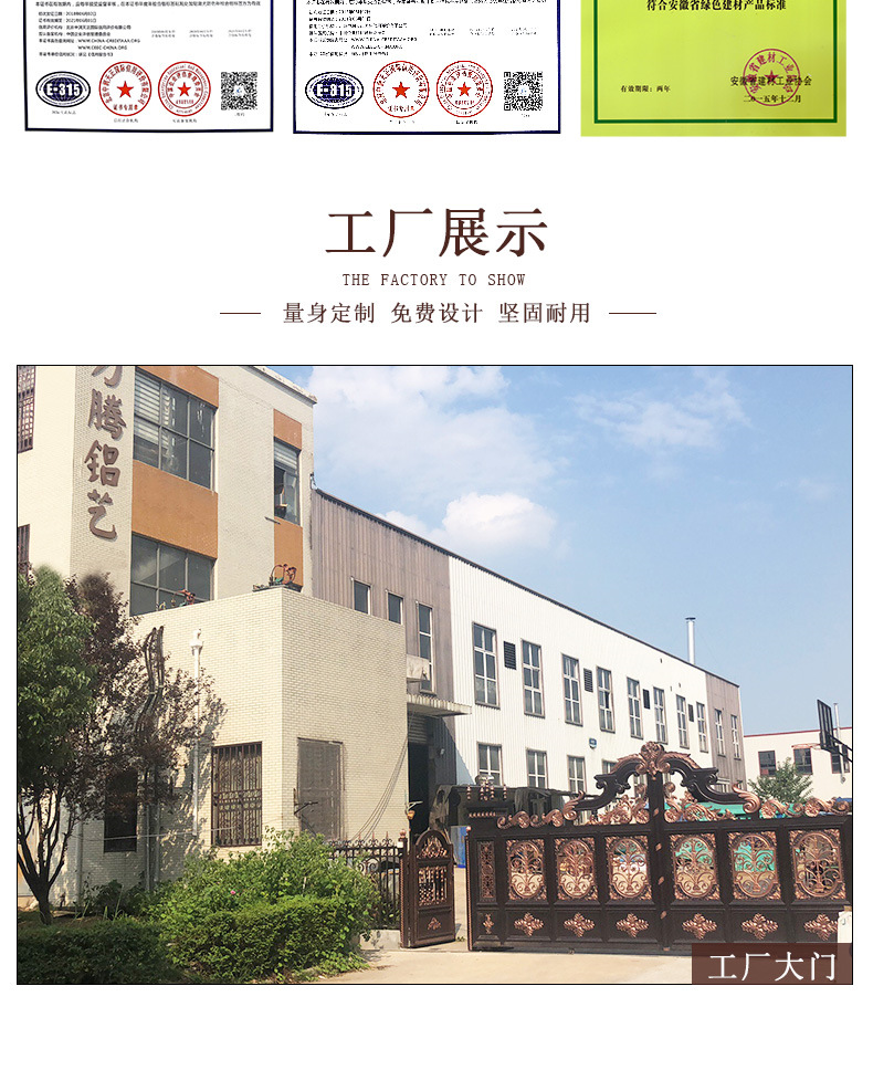 我公司是研发、生产、销售于一体的工厂企业,所有产品都是本公司研发设计。支持定做,因详情页展现图片有限,可咨询客服获取更多款式大门图片!