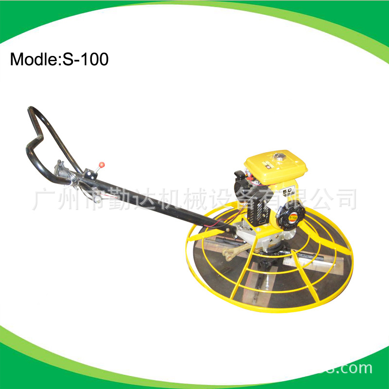 抹光机也称为收光机,它的主要结构是一个汽油机驱动的抹刀转子,在转子中部的十字架底面装有抹刀。抹刀倾斜方向与转子旋转方向一致,由汽油机带动三角皮带使抹刀转子旋转。操作时,先打着火,握住操纵手柄,两个一起往前推是往前移动,一起往后拉是往后移动。平均每小时能做100~300m2,与人工抹光比较可提高工效30倍以上。