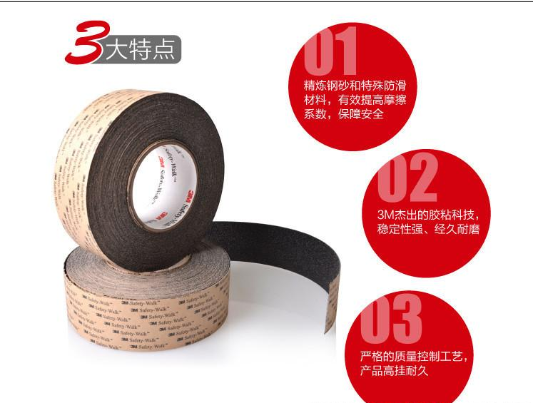 3M安全防滑贴采用精炼钢砂和特殊防滑材料,稳定性强,经久耐磨,施工简便快捷。
