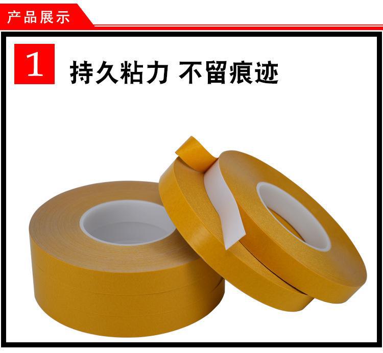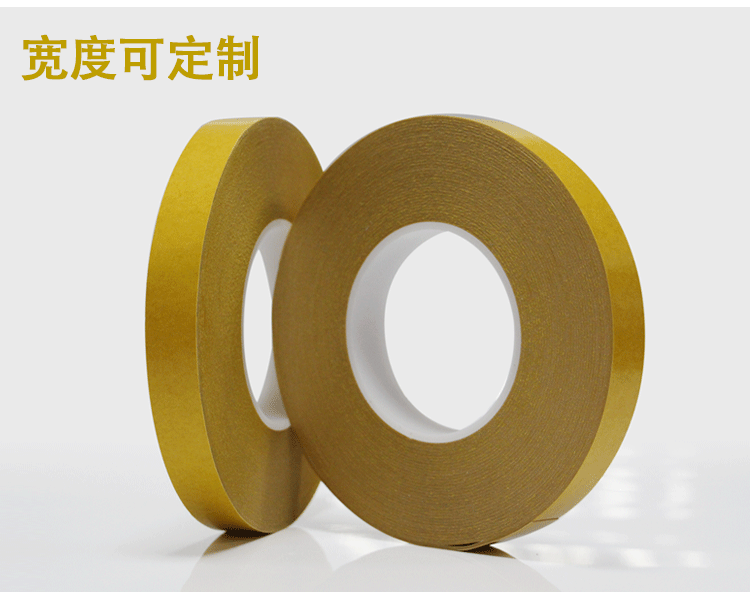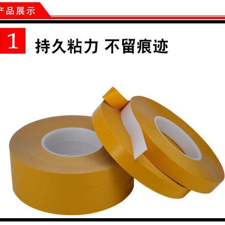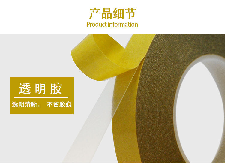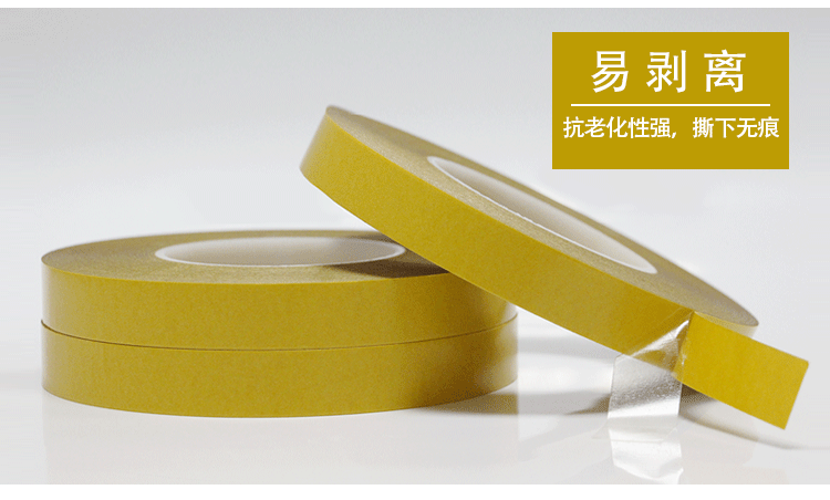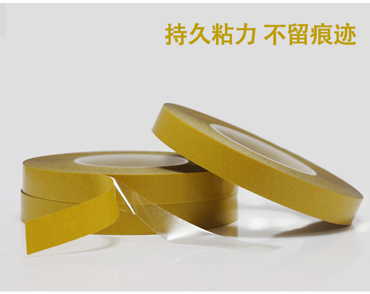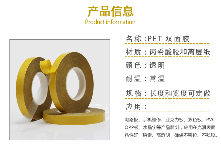 由PET双面涂布丙希酸胶制成,胶带颜色一般为透明和黑色两种,常见厚度规格为:0.03-0.25MM,具有良好尺寸稳定性、热稳定性、化学稳定性,初粘性和持粘性好,易模切加工,对塑胶、橡胶、铭牌均有良好的粘性;能适用于更宽的温度范围和恶劣环境;长期耐温100-120℃,短期耐温可达140-200℃;
