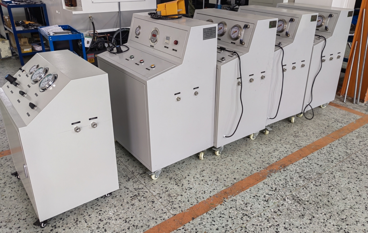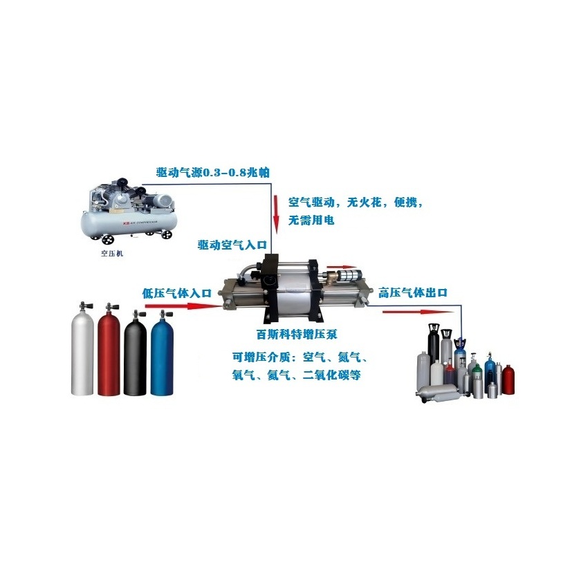 将低压气体增压,实现高压气体输出。气体高压增压、气体高压灌装、高压气密试验,氮簧充氮等