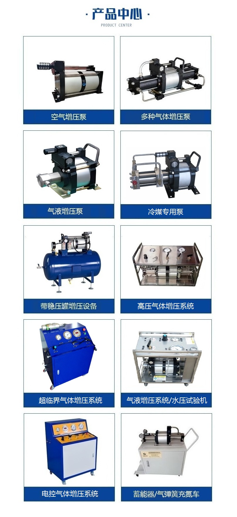 增压泵可用于空气、、氮气、氩气、氦气、二氧化碳气等气体,将分别采用不同的增压泵和特殊的管路、元件,如选用的增压泵驱动腔与增压腔之间有隔离腔,可防止被增压气体和压缩空气混合,避免被增压气体遭受污染。