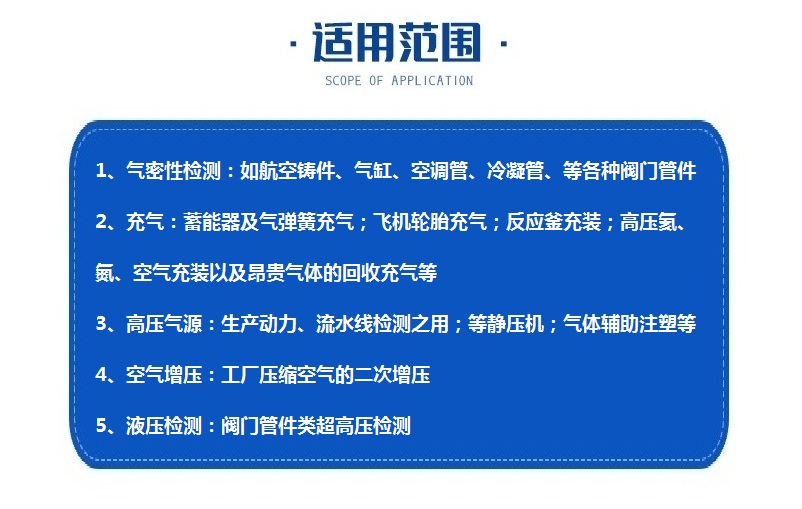 4、主要用于工厂压缩空气的二次增压,高压反应釜的充装,其它需各种高压气体的场合;