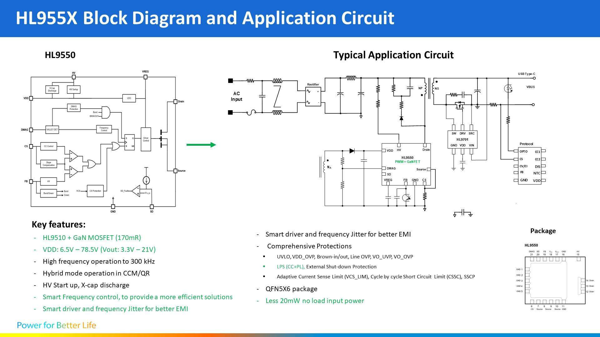 HL955X 系列在 HL9510 基础上合封氮化镓器件,通过智能驱动器和跳频实现更好的 EMI 性能,芯片通过内置电路即可满足LPS要求,无需额外的VDD钳位电路即可实现宽范围电压输出。 HL955X 系列合封氮化镓方案通过集成 VDD、LPS 等电路,节省 BOM 成本,缩小 PCB 尺寸。同时采用的 DFN5*6 封装加大了 GND 铜皮面积,有利于散热。HL955X 系列在 QR 和 CCM+QR 模式下均支持恒流曲线和限功率曲线,同时支持无协议恒流限功率应用。