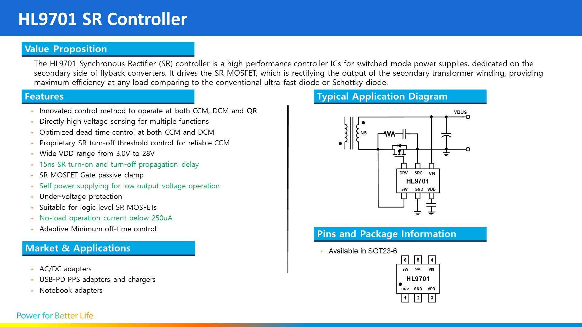 HL9701 是一颗用于开关电源的高性能同步整流控制芯片,采用 SOT23-6 封装,支持低电压补偿和钳位功能,适用于正端或负端应用,支持 QR/CCM/DCM 各种运行模式。 HL9701 可以有效钳制 SR Gate 电平,避免电流倒灌。
