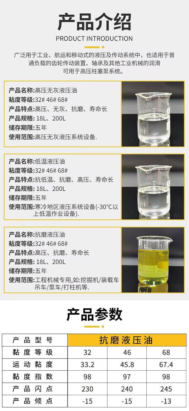 8、该油品主要适用于钢摩擦副的液压油泵。用于其它材质摩擦副的液压油泵时,必须要有油泵制造厂或供油单位。