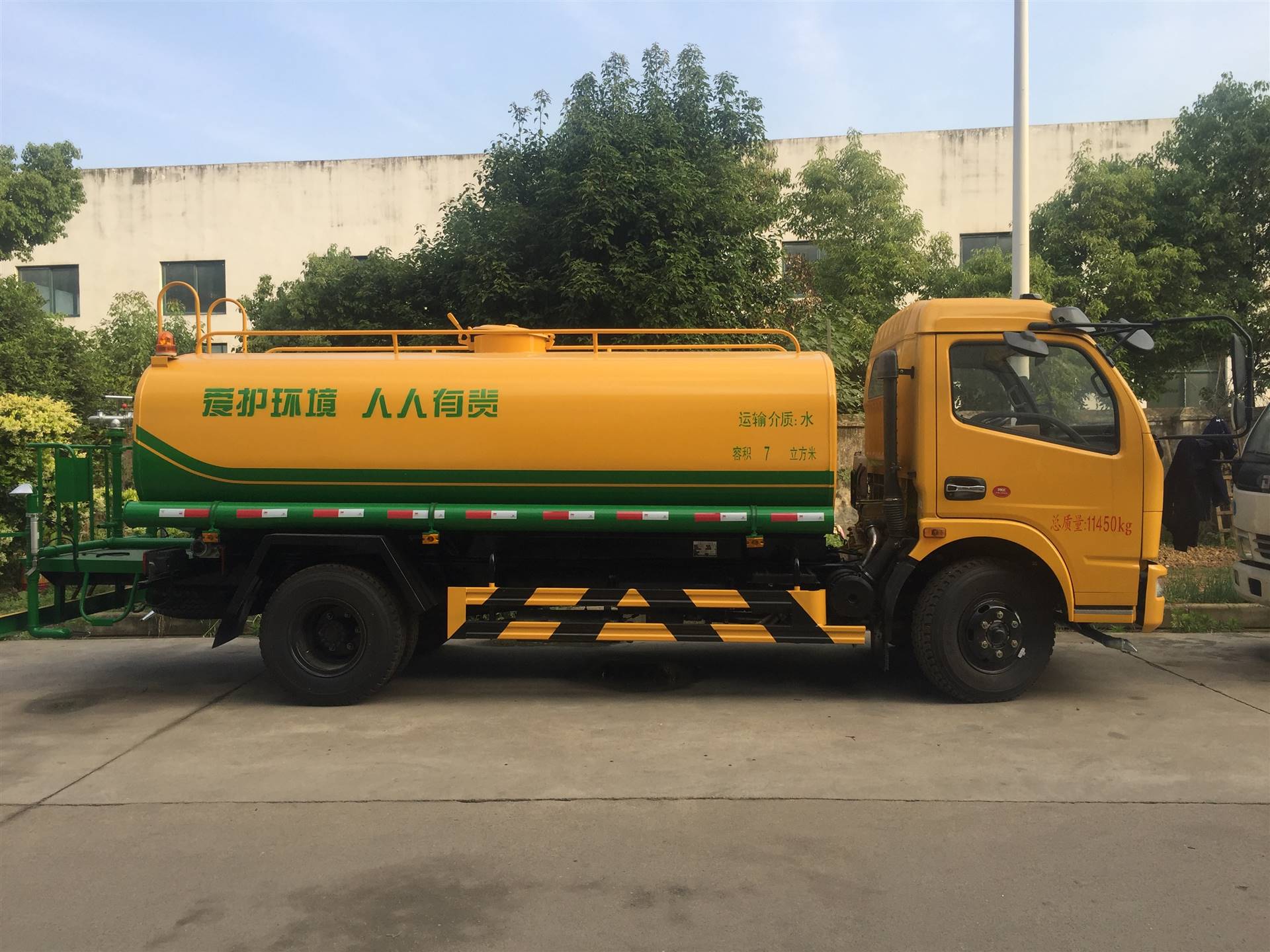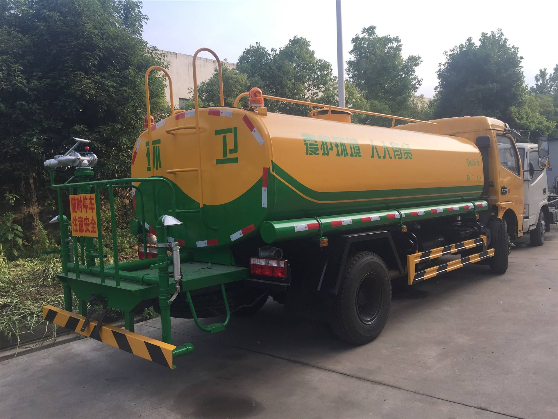 上装部分:罐体采用国标4MM碳钢板制造,实际容积:8.8吨,筒体/封头采用自动无缝焊接、大型卷板机一次性滚压成型,罐体内部设计防波浪隔板(能有效减少运输过程中液体对罐壁的冲击),且隔板间互通,罐体顶部带罐口。配备9吨级专用车载水泵,可自吸自排,从消防栓或自然水源均可取水,垂直吸程>7米,前冲、后洒、侧喷、自流阀、消防快接口,后置工作平台,高压水炮,射程>28米,炮喷射形状可调:直冲状、大雨、中雨、毛毛雨,可连续调节,360°旋转.紧急时可作为消防车使用。