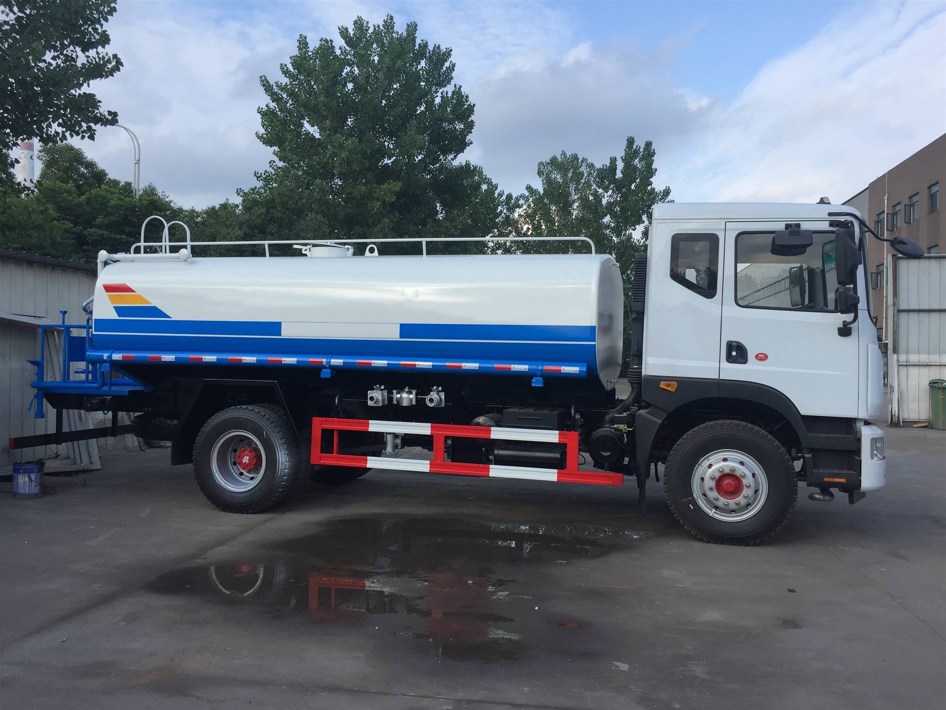罐体采用国标4MM碳钢板制造,实际容积:12.3立方(吨),配备12T级专用车载水泵,可自吸自排,从消防栓或自然水源均可取水,垂直吸程>7米,前冲、后洒、侧喷、自流阀、消防接口,洒水宽度>14米,后置工作平台,高压水炮,射程>30米,炮喷射形状可调:直冲状、大雨、中雨、毛毛雨,可连续调节,360度旋转.紧急时可作为消防车使用。