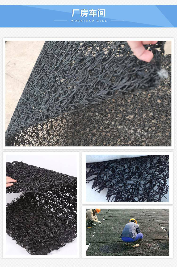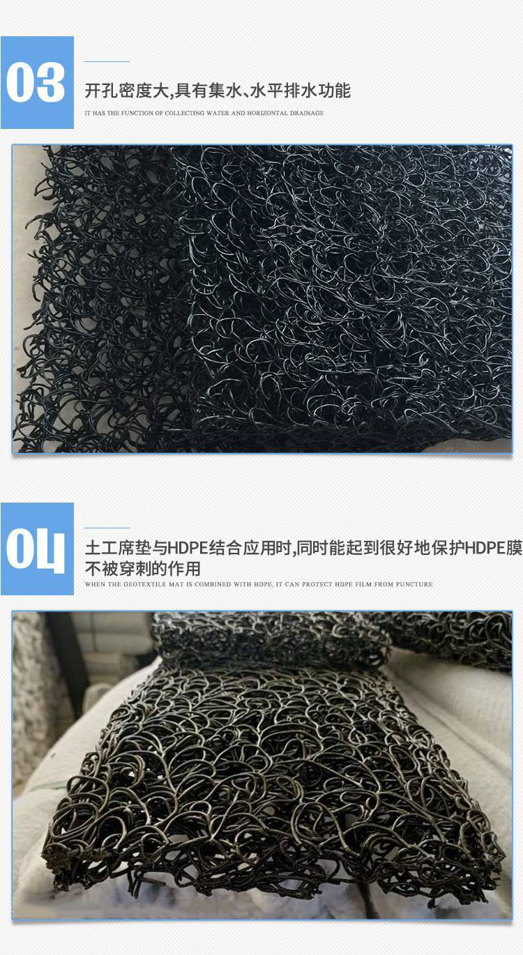 排水席垫、渗排水网垫、排水网垫、渗排水片材也叫土工席垫,是一种以乱丝熔融铺网而成的新型土工合成材料,它耐压高、开孔密度大,具有集水、水平排水功能。组成结构是一个立体的土工网芯,两面都配有针刺穿孔无纺土工织物。立体土工网芯能够迅速地排出地下水,自身还有一个孔隙维护系统,能在高荷载下阻断毛细水。同时,它还能起到隔离加固作用。