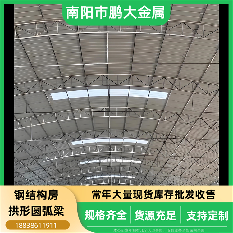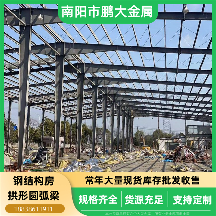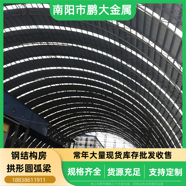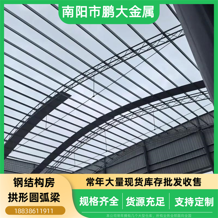(1)二手再用钢材部:常年大量库存批发出售各类二手再用钢结构房拱形圆弧梁,规格齐全,价格非常经济实惠,我们的货场正常常年库存有几千架二手圆弧梁。