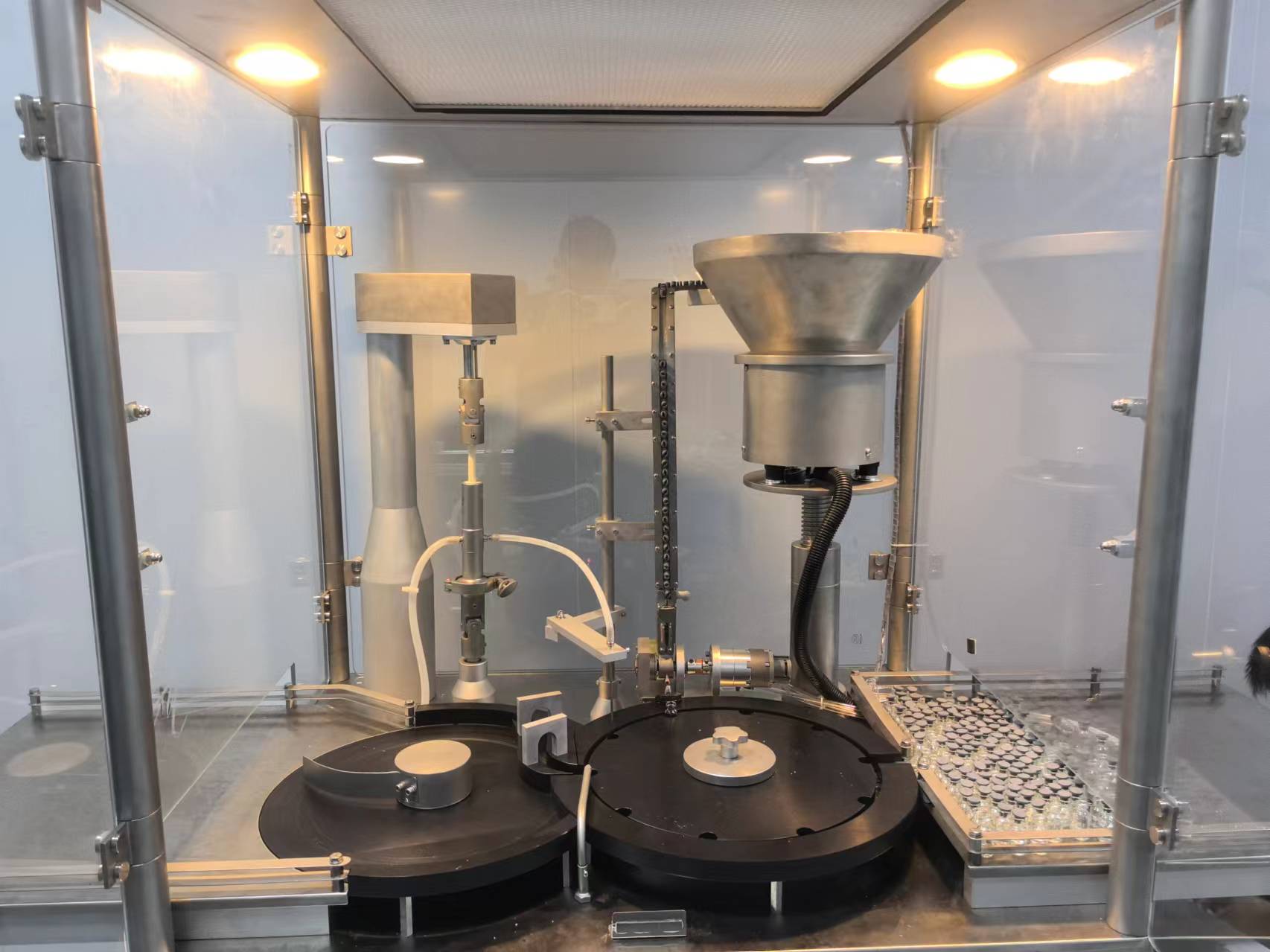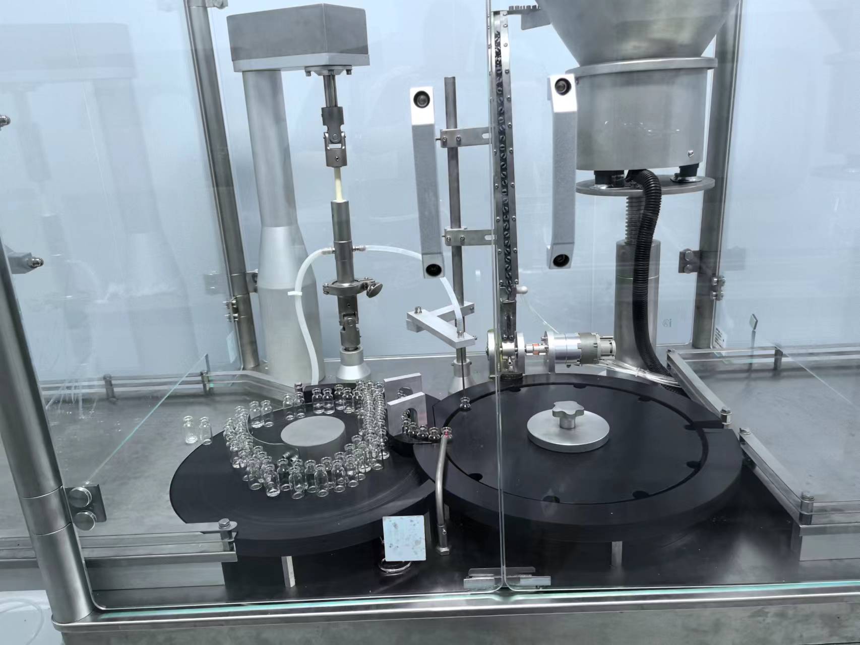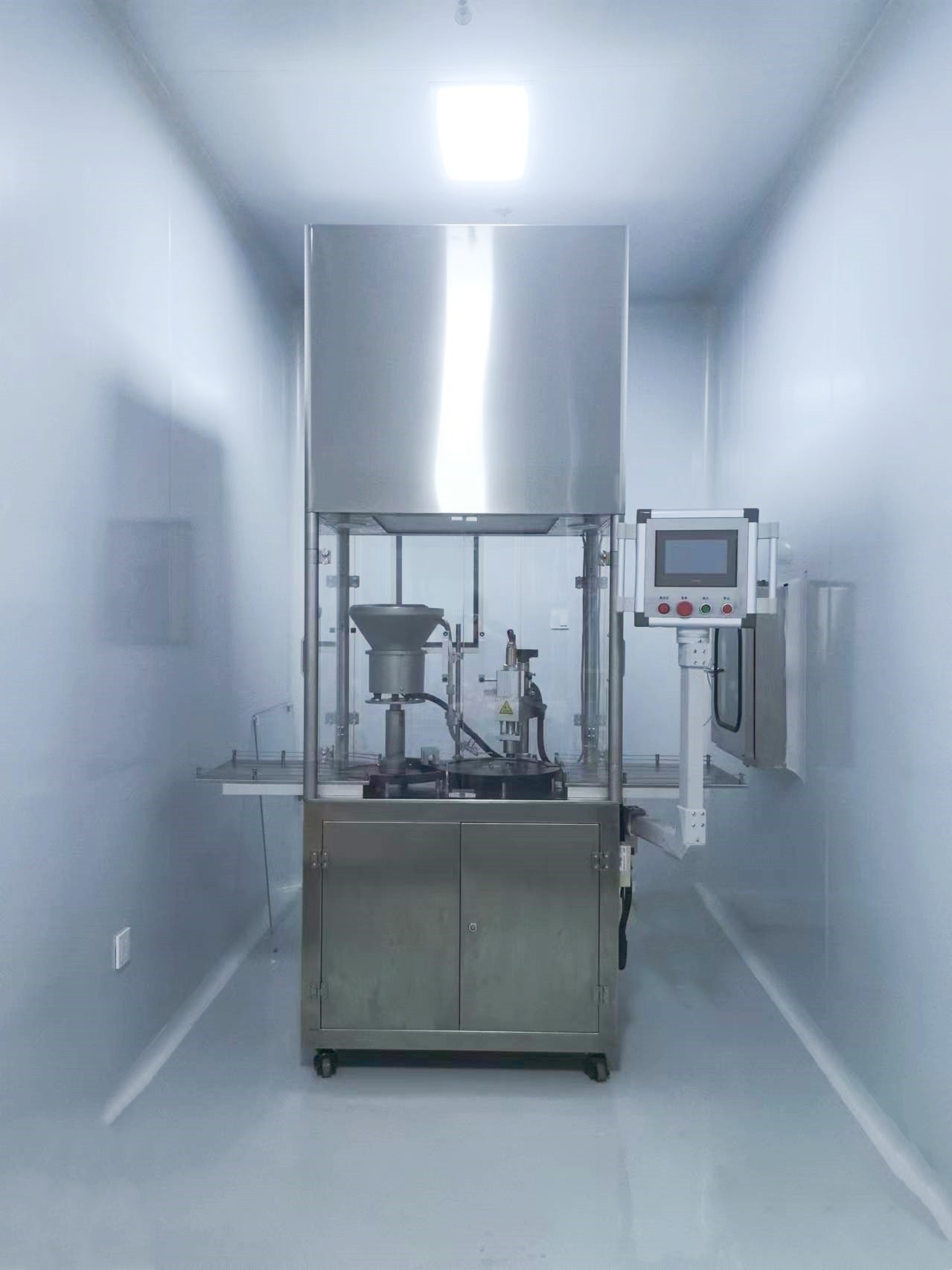 在另外一台机器上操作,主要适合于冻干液体的灌装、加塞、轧盖。