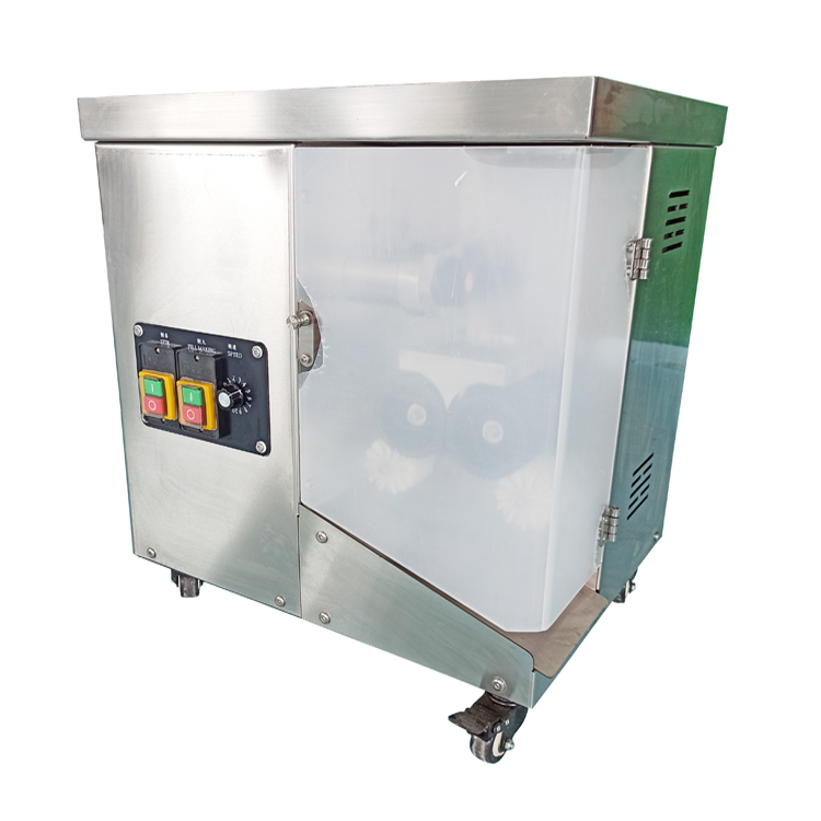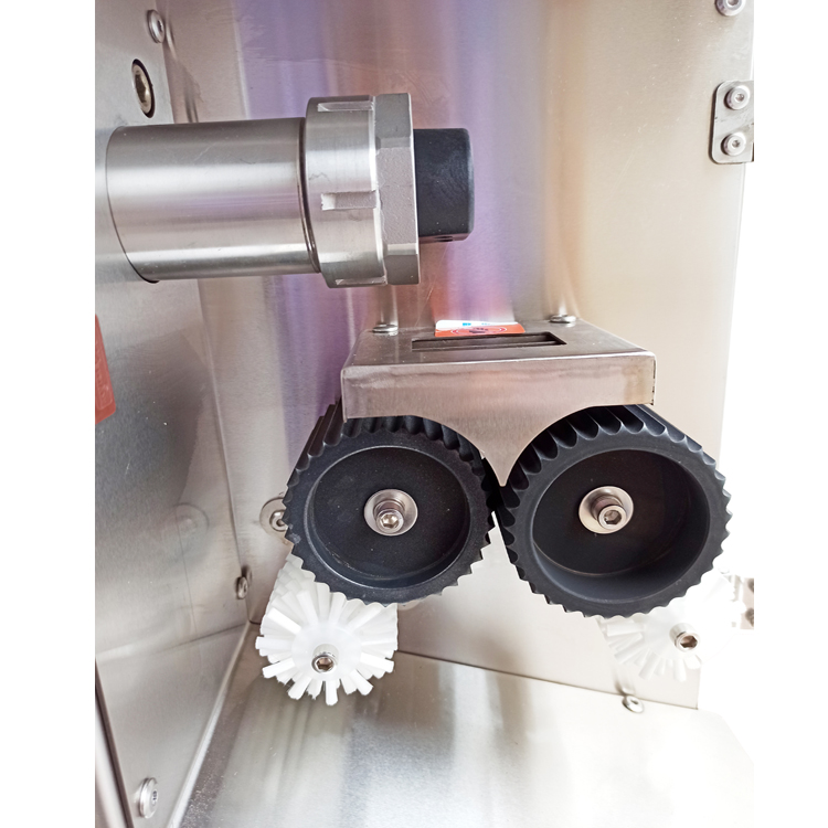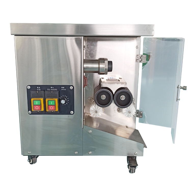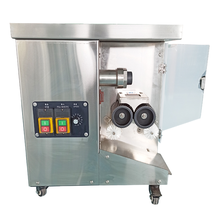 1、本机是制条和制丸一体的全自动制丸机,出条机构在搓棍的左上方,直向出条并与两搓棍垂直,结构简单、清洗维修方便。2、制条机构采用了齿轮减速电机传动平稳,制丸部分安装在一个箱式变速箱内,搓棍传动机构轴和转动传动机构轴垂直安装在变速箱内,两种机构各配有传动电机,变速箱内灌装有润滑油。3、制条是通过螺杆挤压物料,螺杆配有旋转的物料压板、被挤压受力的物料通过成型模时成条,制丸过程是条通过旋转运动和轴向往复运动的一对轴刀(一对轴刀圆周面上加工有要成型丸直径对应的半圆槽)时成型。4、一对轴刀转速通过调速按钮可以调,本机调速范围0-50转/分,具体调速要求是跟出条速度同步就可以。5、一对轴刀圆周外表面上涂有一层特氟龙,另外每个轴刀上配有毛刷,防止搓丸过程物料粘上轴刀。6、制条挤压螺杆、制条物料压板、制条模、制丸轴刀、清理毛刷拆装和清理方便。7、机构紧凑,噪音低,可以一人操作几台设备,节省劳力。
