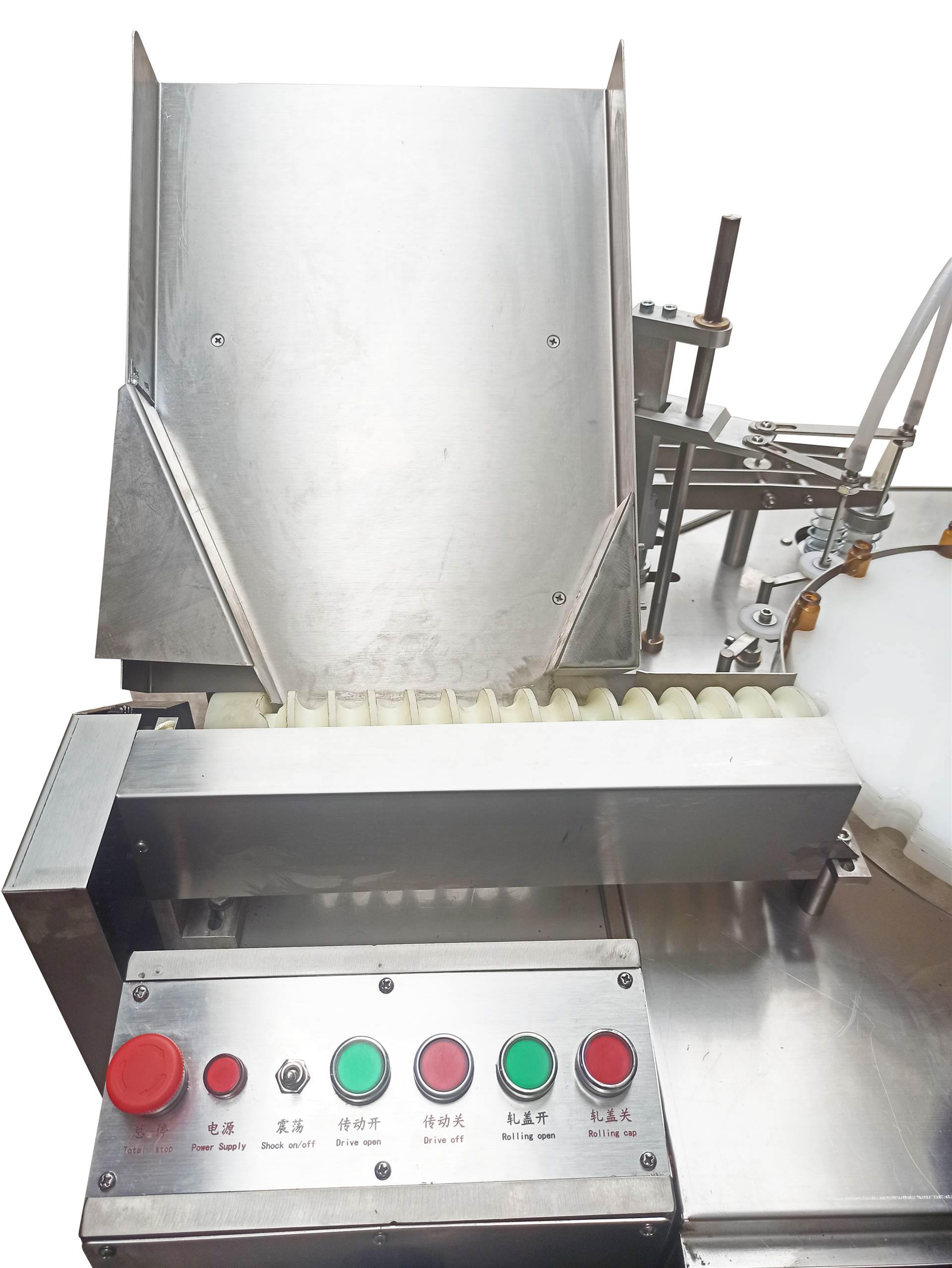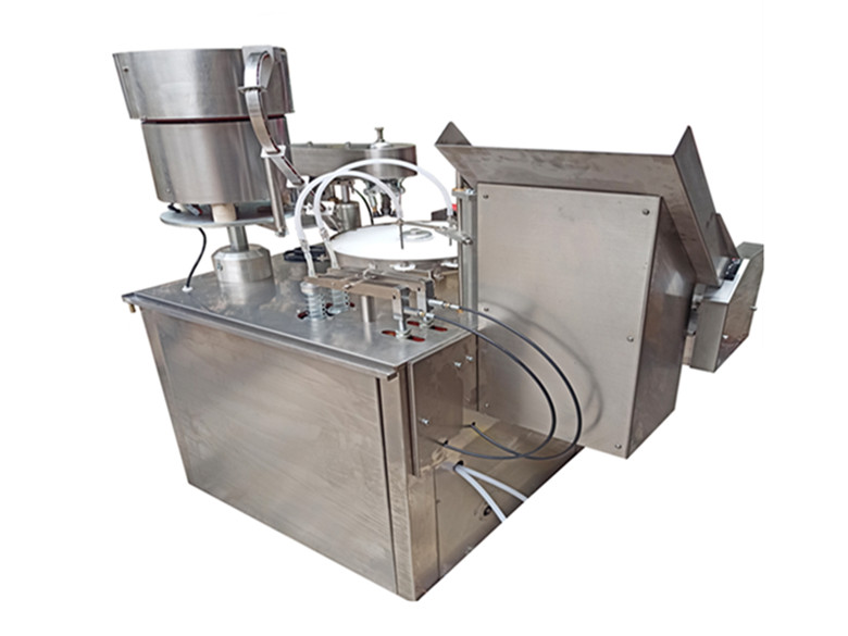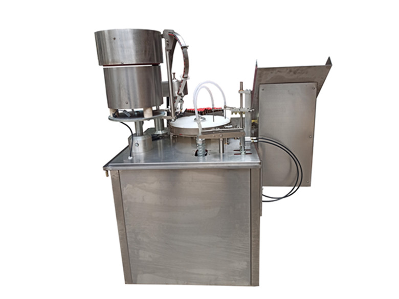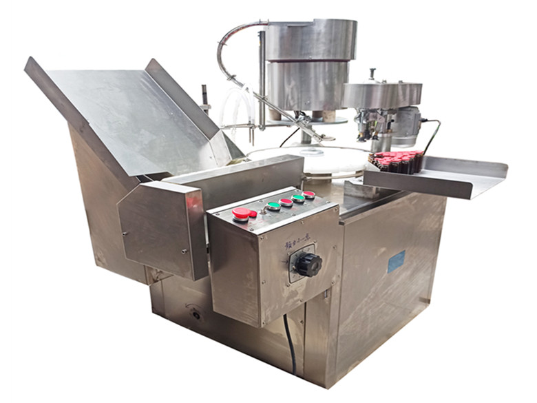 适用于制药厂小剂量的酊水,糖灌装和轧盖工序,全机可完成理瓶、输瓶、定量灌装、理盖、送盖、轧盖工序,凡与药物接触的零部件均采用 304L 不锈钢或 PTFE 制造,具有无瓶不灌装,等功能。