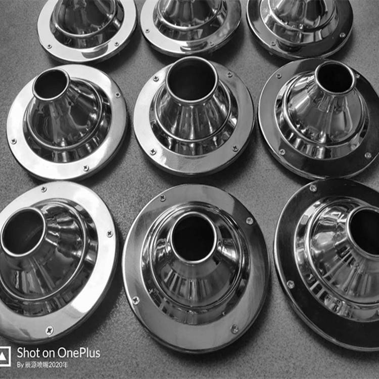 不锈钢材质抛光镜面,外观靓丽高档,风口隐藏于平面以下,不会对通过的产品及人员造成挂伤或阻挡,喷吹方向可任意调动,304不锈钢材质更是不会生锈和氧化,经久耐用 辰源的隐藏式风淋喷嘴是把风嘴、外底座,碗杯盖组合成型,底座用螺丝固定冷风室的墙板上,风嘴隐藏于内部,不易挂到工件,可加密封条具有密封和消音作用。根据风压一定,喷嘴孔横截面积越小,风速越大的原理,进风口与出风口直径的递减式缩口设计,使风量集中,流速加快而具有“强冷风喷嘴”的美称,一般采用金属材质冲压成型,特殊需求下也可以采用不锈钢材质。吹风喷嘴风淋喷嘴 辰源喷雾生产的风淋喷嘴一般采用金属材质冲压成型,特殊需求下也可以采用不锈钢材质。典型应用:1、冷风吹干流水线2、高温烘干流水线3、空调送风、岗位送风4、烘干、吹干、烤箱、烤炉、局部送风。