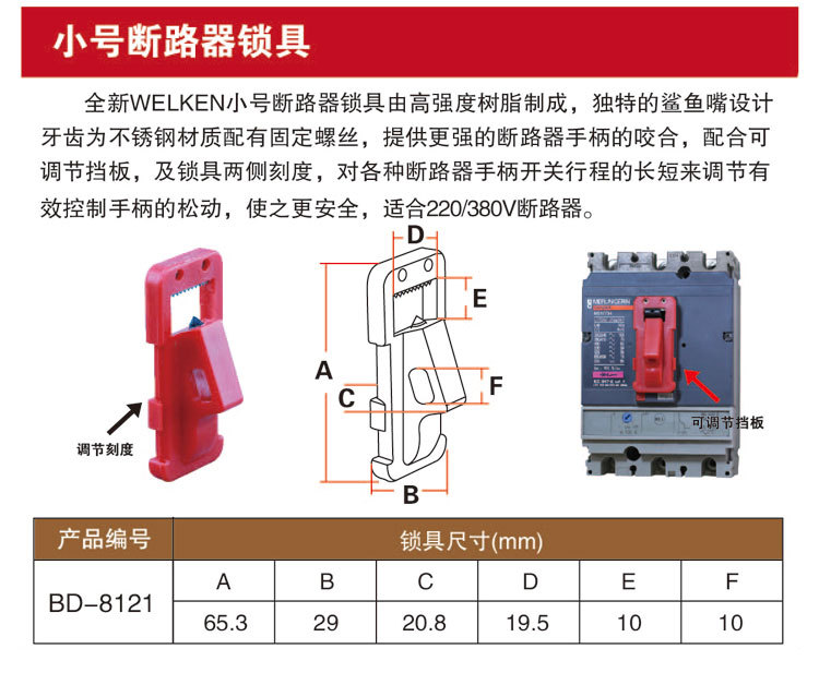 全新WELKEN小号断路器锁具由高强度树脂制成,独特的鲨鱼嘴设计牙齿为不锈钢材质配有固定螺丝,提供更强的断路器手柄的咬合,配合可调节挡板,及锁具两侧刻度,对各种断路器手柄开关行程的长短来调节有效控制手柄的松动,使之更安全,适合220V/380V断路器。
