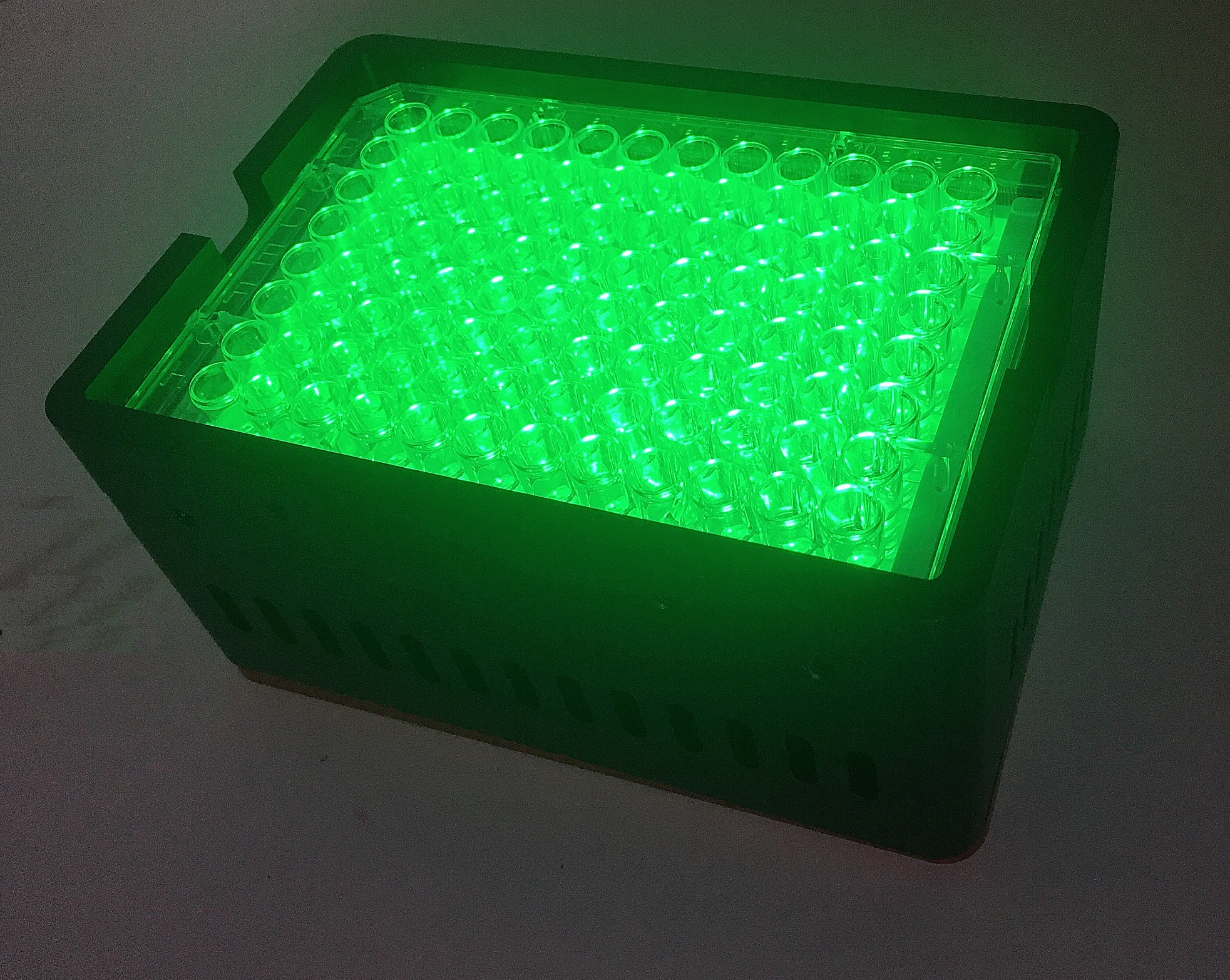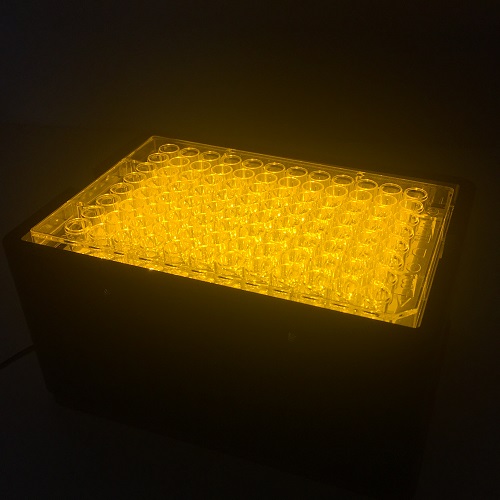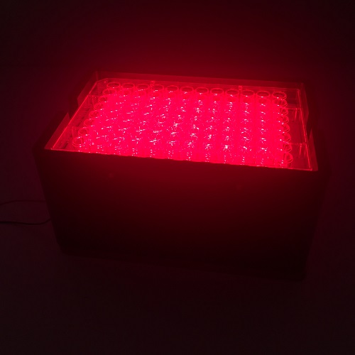 本产品是专门针对评价光敏剂和光热材料而推出的LED光源的体外细胞光毒性照射机,其体积小巧,与标准96孔细胞培养板配合。为药物作用于细胞及微生物的光毒性效应提供光源和效应场所。区别于传统光毒性照射仪的点光源,本款产品采用LED面光源,发光均匀,实现对所有细胞培养孔的均匀照射,减少了平行试验次数,可以增加科研工作者们的实验效率。除此之外,产品还具有发光强度可调,可定时控时,波长或发光位置可预先定制,灵活便捷等特点,并配有亚克力灯罩保护操作者的眼睛。