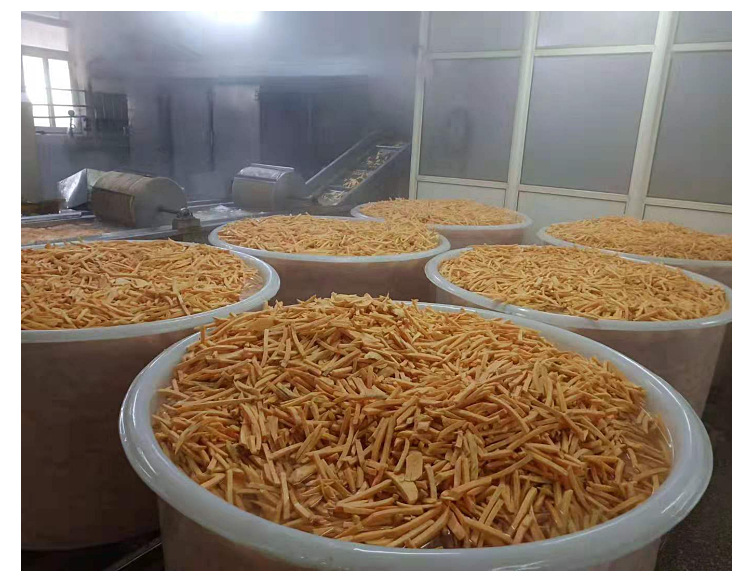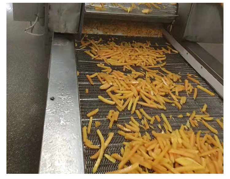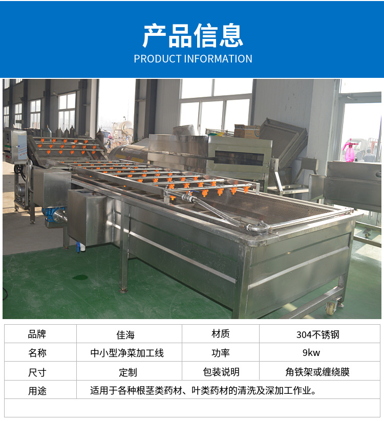 产线前段为表面清洗,清洗完后进行食材粗加工(要切片的用切片的机器,切丝就用切丝的机器等),然后就是