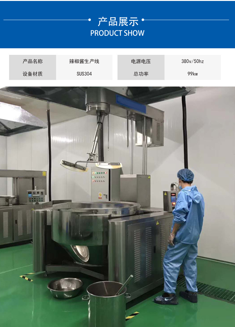 该辣椒酱生产整体解决方案,包括香菇酱、牛肉酱、辣椒酱、风味酱的生产加工流水线。从原料加工到炒制、中转、灌装、真空旋盖、贴标、