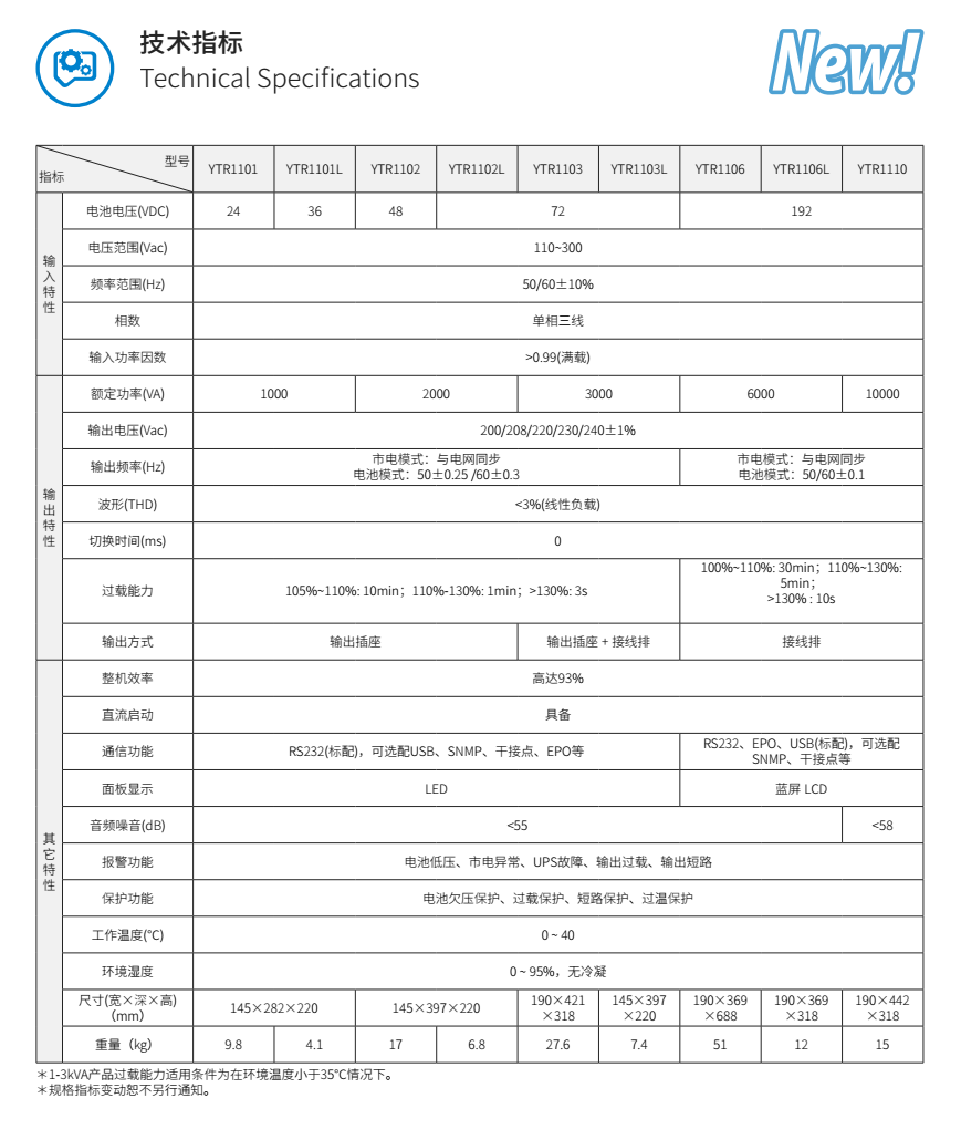 | 产品详情 精卫 NEW YTR 智能化高频 UPS,采用数字化控制技术和高频电源变换技术,具有体积小、性能高等特点,节能效益显著,大幅减少运营成本。集交流稳压、后备电源、尖峰浪涌吸收等多功能为一体,满足恶劣电网环境的电力保护,为负载提供纯净、安全、稳定的电源。 ●体积小巧 适应性强 高功率密度,结构设计优化,体积更小巧 适用于办公室、柜台等工作使用环境,降低用户空间成本 类模块化设计,大幅减少线材,安装维护更方便 ●性能 优异指标 业内先进的整机效率,整机满载效率高达 93%,极大的节省了能量消耗,大幅减少客户运行成本 超强的过载能力,带载 110% 可稳定持续 30min 不断电,保障设备安全正常运行 ●绿色电源 双向保护 输入功率因数 >0.99,提高电能利用率,有效避免额外能量损失,消除对电网污染,降低耗能费用 所有器件均符合国际环保 RoSH 标准,绿色无害 ●智能风机 高效制冷 多种模式智能调节转速,延长风机使用寿命,进一步提高整机效率,降低损耗 降低整机噪音,为客户营造绿色舒适的工作环境 ●大屏高清 曲面显示 蓝屏背光大液晶显示屏,可视角度高达 140°,用户从不同角度均能轻松读取数据 曲面显示效果,让可视空间更宽广,优化视觉体验 ●电池管理 自主专利 实时电池剩余容量显示,便于观测电池工作状态 可支持电池温度补偿,延长电池使用寿命 完善的电池保护功能,保证电池不受损坏,延长电池使用寿命 ●智能启动 电不间断 可支持来电自启动功能,一旦市电恢复即可自动连接用电设备 具备直流启动功能,无市电情况下,UPS 可正常开机启动 来电自动恢复电池组充电,无需人工干预