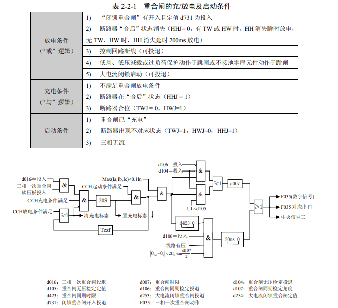 6) 重合闸的整个动作应在整组复归时间 Tzzf 内完成,在 Tzzf 到达后重合闸整组复归,所有计数器清零,并清除所有标志。当出现“放电”条件和重合闸动作全部完成后也整组复归。三相一次重合 Tzzf =20s/120s(退/投同期检查)。