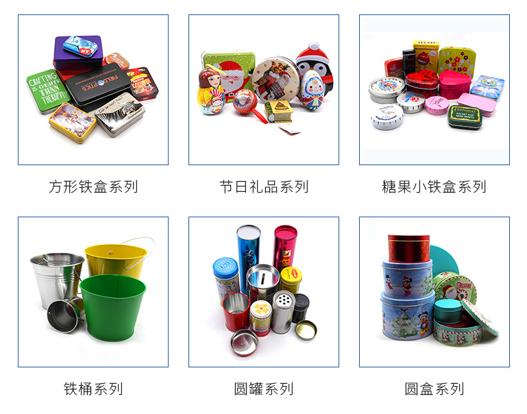 铁罐常见种类有:天地罐,两片罐,锣底方罐/圆罐,扣底方罐/圆罐,拍底方罐/圆罐,扣底缩口罐,带铰翻盖铁盒,推拉盒,手提铁盒,盖底同模,底拉伸,平雕,3d浮雕,拉链包