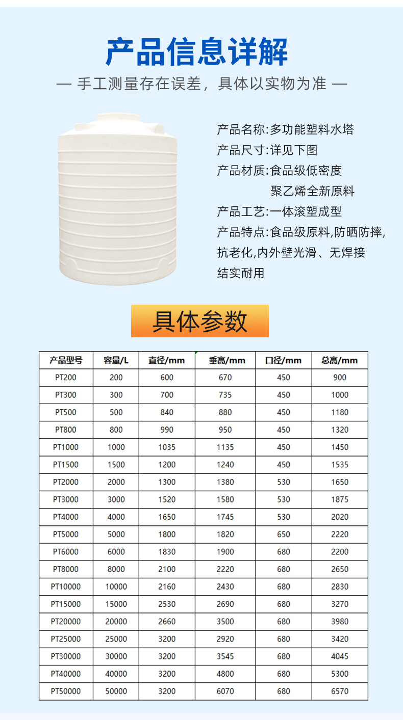 4、滚塑塑料水塔在大规格大容量大体积的产品上有非常大的优势,尽管体积大,但仅然保持一次成型整体性的特点,这是其它储罐工艺所达不到之处。