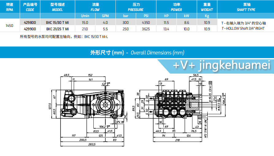 型号描述:BKC 15/30T MI 产品编号:429800流量:15.0L/min 4.0GPM 压力:300bar 4350psi 功率:11.5HP 8.6kw 重量10.9kg 转速:1450泵轴:T-右输入端为3/4″的空心轴