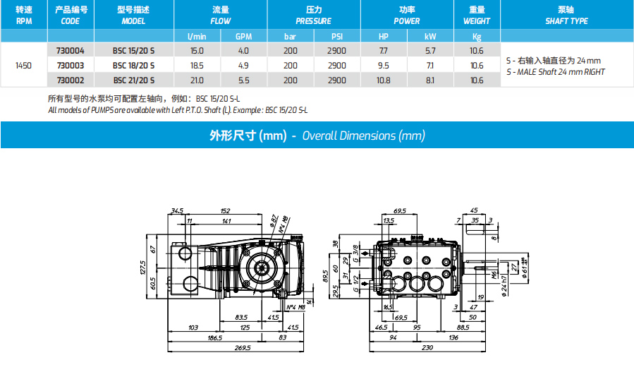 型号描述:BSC 18/20S 产品编号:730003 流量:18.5L/min 4.9GPM 压力:200bar 2900psi 功率:9.5HP 7.1kw 重量10.5kg 转速:1450右输入轴直径为24mm