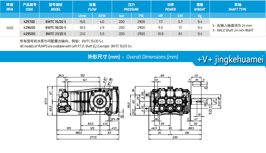 型号描述:BWTC 15/20S 产品编号:429700 流量:15.0L/min 4.0GPM 压力:200bar 2900psi 功率:7.7HP 5.7kw 重量9.4kg 转速:1450右输入轴直径为24mm