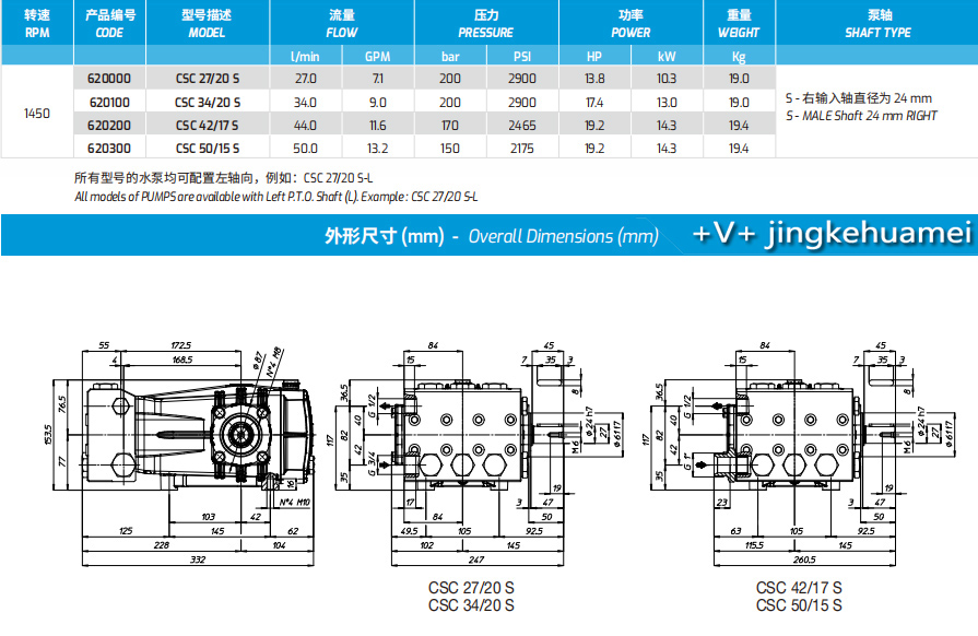 型号描述:CSC 27/20S 产品编号:620000 流量:27.0L/min 7.1GPM 压力:200bar 2900psi 功率:13.8HP 10.3kw 重量19.0kg 转速:1450右输入轴直径为24mm