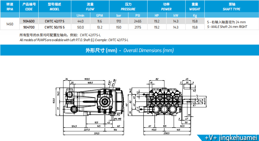 型号描述:CWTC 34/20S 产品编号:904400流量:34.0L/min 9.0GPM 压力:200bar 2900psi 功率:17.4.4HP 13.0kw 重量15.8kg 转速:1450右输入轴直径为24mm