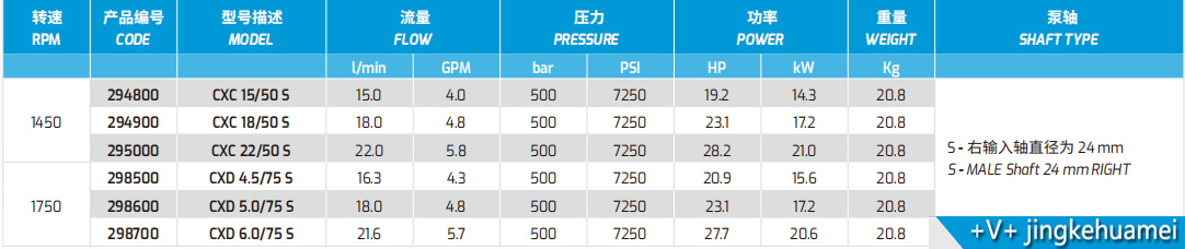 型号描述:CXC 15/50 S 产品编号:294800 流量:15.0L/min 4.0GPM 压力:500bar 7250psi 功率:14.3kw 重量20.8kg 转速:1450泵轴:R-右输入轴直径为24mm