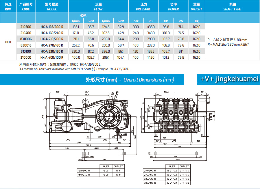 型号描述:HX-A 135/300 R产品编号:310500 流量:NOM 135.1L/min 35.7GPM丨124.5L/min 32.9GPM 压力:300bar 4350psi 功率:71.4kw 重量162.0kg 转速:800右输入轴直径为80mm