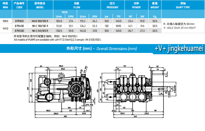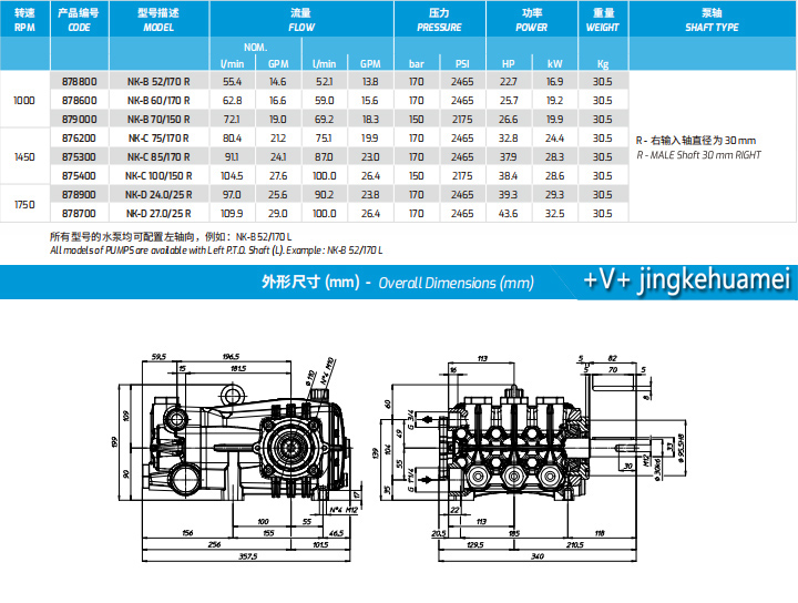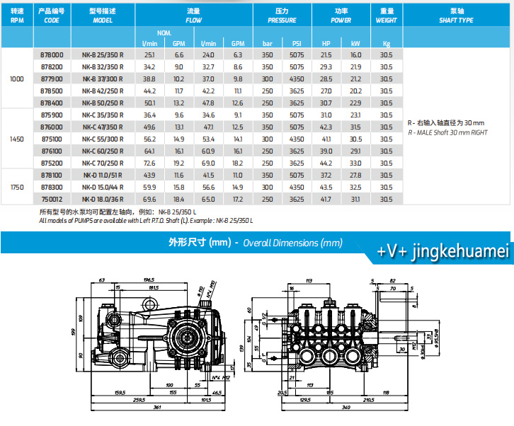 这些泵型号描述:NK-B 25/350 R 产品编号:878000 流量:NOM 25.1L/min 6.6GPM丨24.0L/min 6.3GPM 压力:350bar 5075psi 功率:16.0kw 重量30.5kg 转速:1000泵轴:R-右输入轴直径为30mm