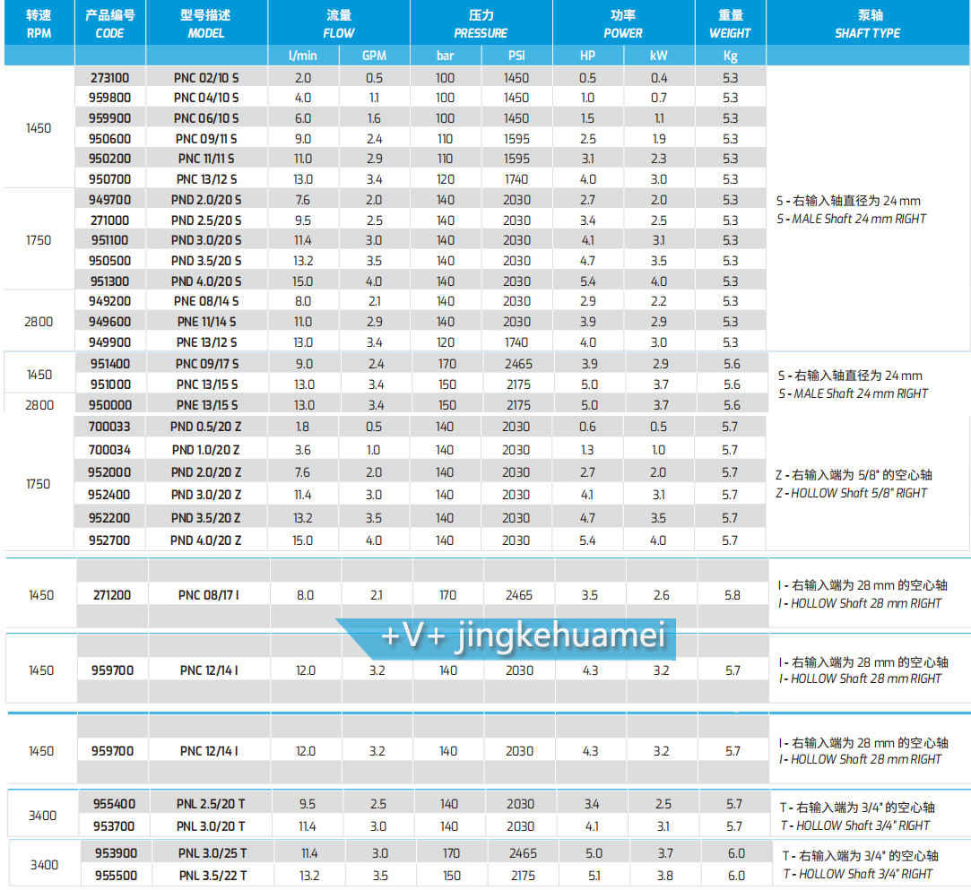 型号描述:PNC13/12S 产品编号:950700 流量:13.0L/min 3.4GPM 压力:120bar 1740psi 功率:4.0HP 3.0kw 重量5.3kg 转速:1450右输入轴直径为24mm