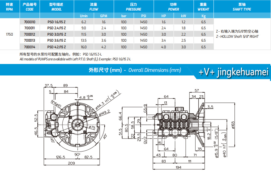 型号描述:PSD 3.6/15Z产品编号:700013 流量:13.5L/min 3.6GPM 压力:100bar 1450psi 功率:3.4HP 2.5kw 重量6.5kg 转速:1750右输入端为5/8'' 的空心轴