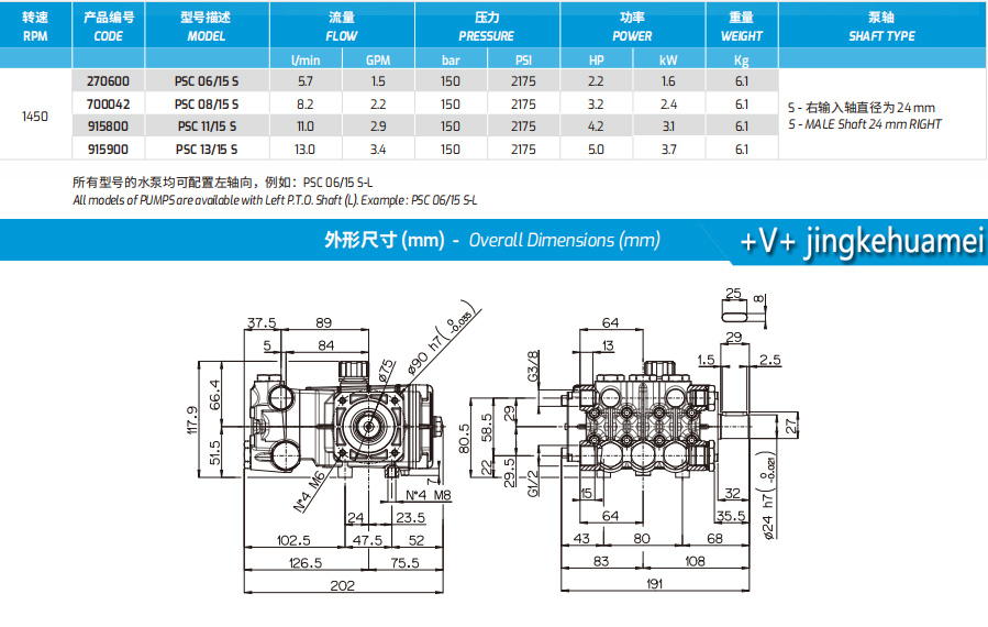 型号描述:PSC 06/15S 产品编号:270600 流量:5.7/min 1.5GPM 压力:150bar 2175psi 功率:2.2HP 1.6kw 重量6.1kg 转速:1450右输入轴为24mm