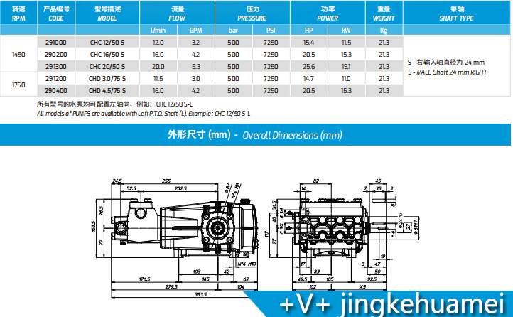 型号描述:CHC 12/50 S 产品编号:291000 流量:12.0L/min 3.2GPM 压力:500bar 7250psi 功率:11.5kw 重量21.3kg 转速:1450泵轴:R-右输入轴直径为24mm