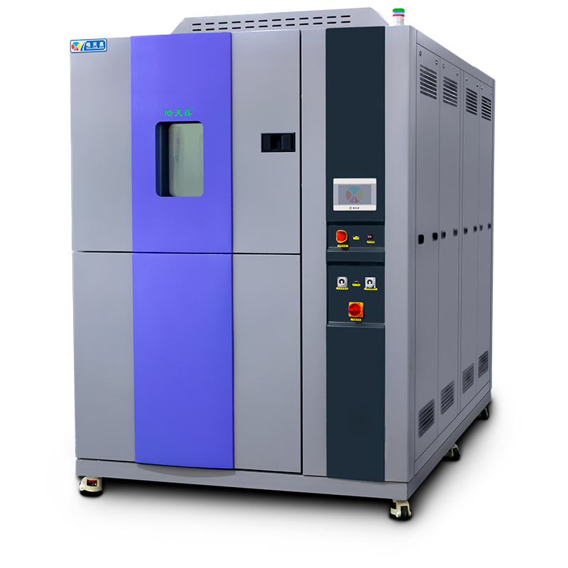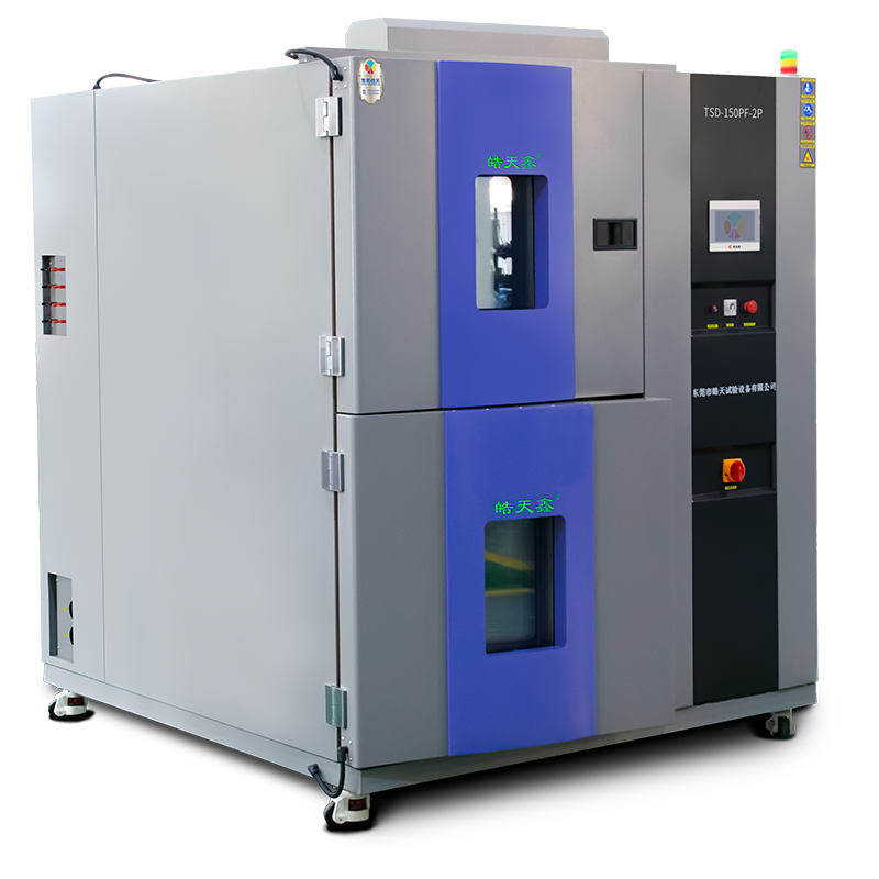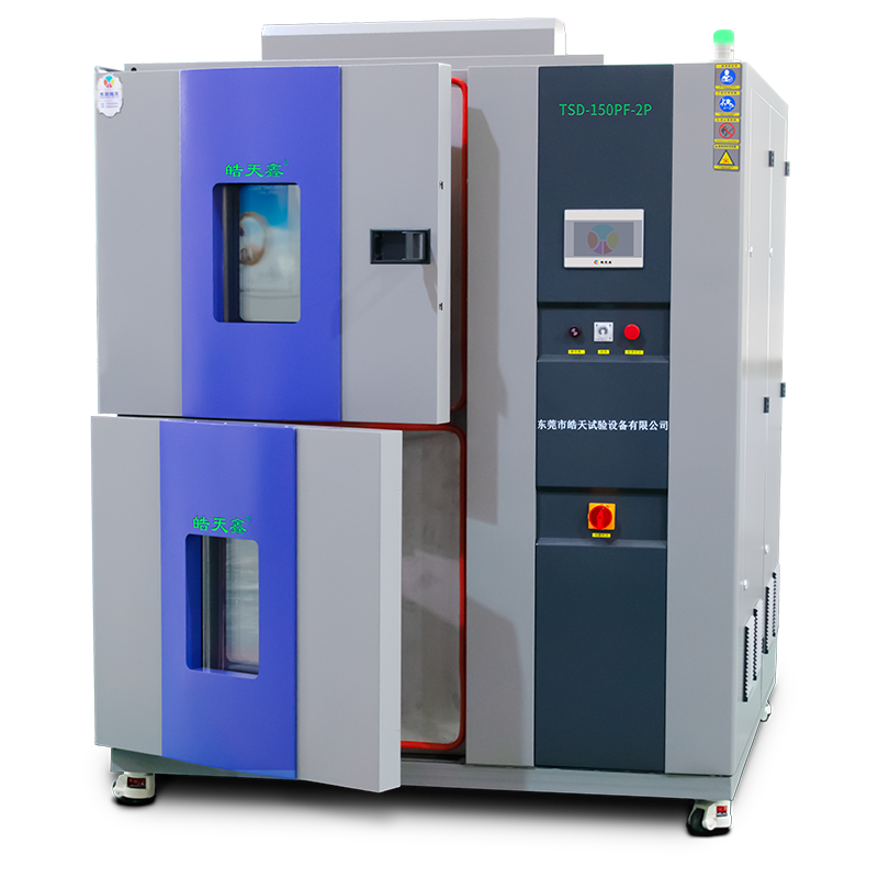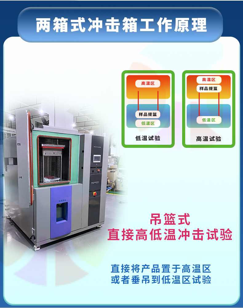 高低温冲击试验箱根据试验需求及测试标准分为三箱式和两箱式,区别在于试验方式和内部结构不同。三箱式分为蓄冷室,蓄热室和试验室,产品在测试时是放置在试验室。两箱式分为高温室和低温室,是通过电机带动提篮运动来实现高低温的切换,产品放在提篮里,是随提篮一起移动的。