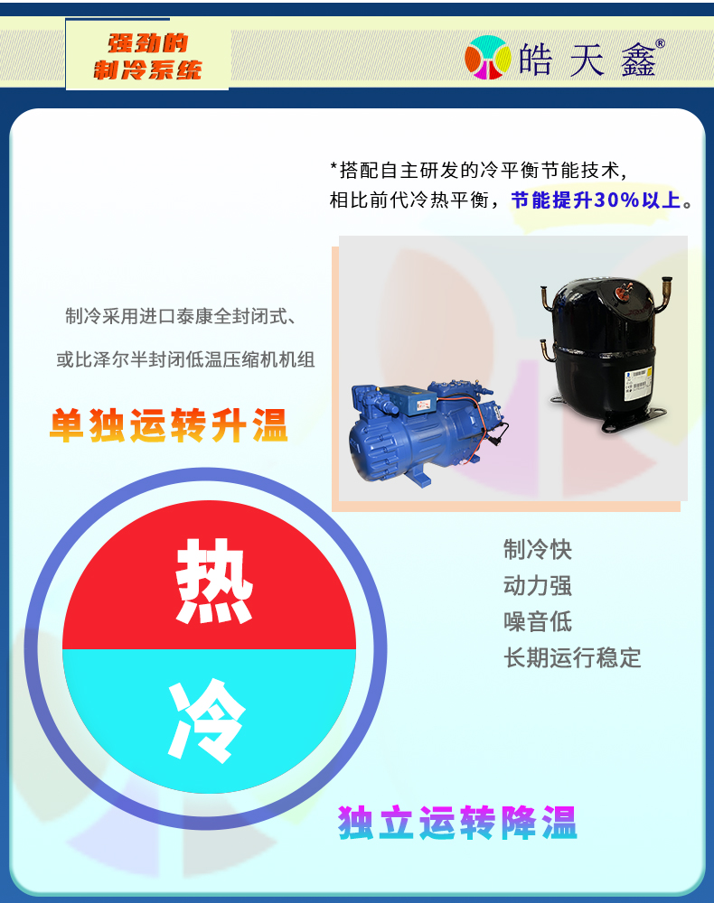 制冷系统及压缩机:为了保证试验箱降温速率和低温度的要求,本试验箱采用一套进口法国全封闭压缩机所组成的二元复叠式风冷制冷系统。复叠式冷 系统包含一个高温制冷循环和一个低温制冷循环,其连接容器为蒸发冷凝器,蒸发冷凝器是也到能量传递的作用,将工作室内热能通过两级制冷系统传递出去,实现隆温的目的。制冷系统的设计应用能量调节技术,一种行之有效的处理方式既能保证在制冷机组正常运行的情况下又能对制冷系统的能耗及制冷量进行有效的调节,使制冷系统的运行费用和故障率下降到较为经济的状态。