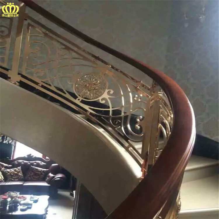 铜艺弧型楼梯护:将铜板进行各种弯曲、焊接,然后固定为各种流畅的造型。铜板材的表面性能,从而给表面处理工艺带来了更多的可选择性吧,常用的表面处理工艺包括:烤漆、电镀、喷砂、描金、静电粉末喷涂、阳氧化等。铜艺是理想的新型装饰材料。铜艺楼梯护栏铜艺楼梯护栏:空间如何利用,首先是楼梯功能满足前提下,充分利用楼梯空间展示楼梯。楼梯功能大致有:上下通道、空间分割、空间点缀等,在设计楼梯时主要是考虑上下通道,满足弧形楼梯尺寸的前提下,尽量使楼梯更具有装饰性,与四周墙面或各个功能空间组合;在一些比较封闭的楼梯空间里,楼梯影响空气流动,对弧形楼梯尺寸的设计要求更高一些。别墅楼梯的装饰,选择一款适合的雕花护栏,比如平雕的郁金香款,默默透漏这雅的气,优雅,恬静使人心情,比起现社会很多浮夸,大显贵气的产品,它更是多了一份柔情。搭配到整个室内环境,又不失风采。要与整体的环境搭配得更加。红古铜艺术楼梯铜艺镂空楼梯镶花护栏的身上,不可以看出高的品,华的,更能感受到美轮美奂、富丽堂皇与时尚搭配,又可以与古风格相适应,与现代高品生活匹配,自身具备的气质决定了广泛的适应性。只要您想得到,我们就做得到,请给我们一个机会,我们将还您一个满意的铜艺艺术楼梯护栏。铜艺弧型楼梯护栏有哪些优点 ? 铜楼梯金属本身有自然光泽,所以效果特别的好,加上现代着色技术,给人的感觉很高。保持原本的金属感同时加上品味的设计,香槟金、玫瑰金、K金(镀黄金)、钛金、红古铜、青古铜等多样性的颜色选择,让消费者可以随心地进行选择。从新工艺、新布局、新材等角度进行造型设计铜艺弧型楼梯护栏,通过尊贵的材述说着一个追求、健康的生活品质。