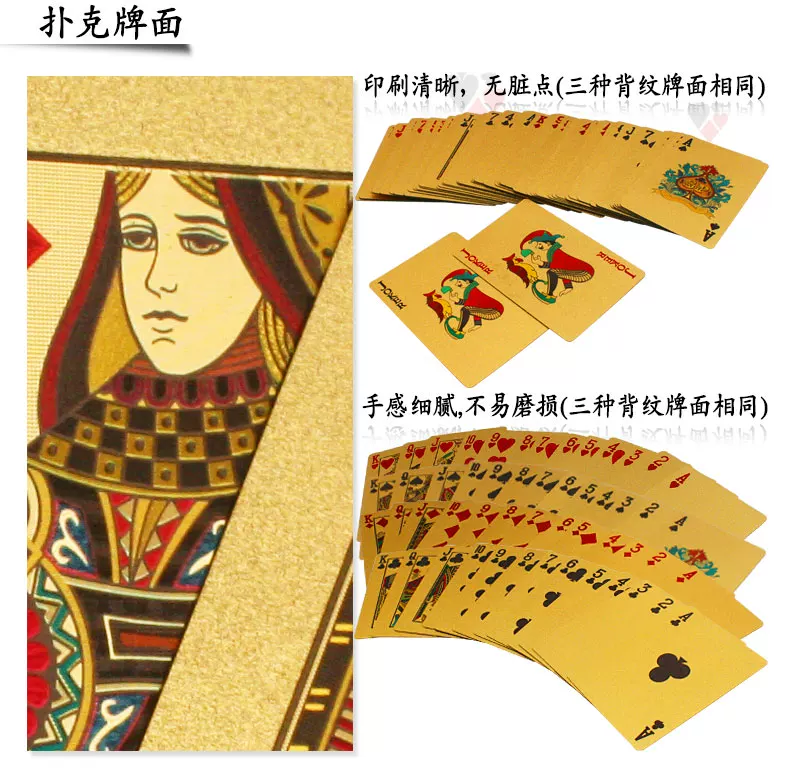 土豪金PVC塑料扑克采用特制单面磨砂一国际娱乐场质量为标准,具有不透光,不沾灰,光滑度好,持久耐用,手感好等特点。包装为塑膜压封,高档奢豪华塑料盒和木盒包装,无论外观或是扑克牌品质,均堪称之精品,是扑克收藏家和使用者的优先选购之物。