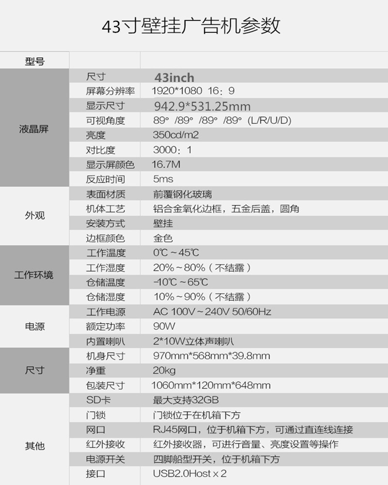 尺寸43寸液晶屏(注:此款常规尺寸有18.5寸,21.5寸,32寸,43寸,55寸)