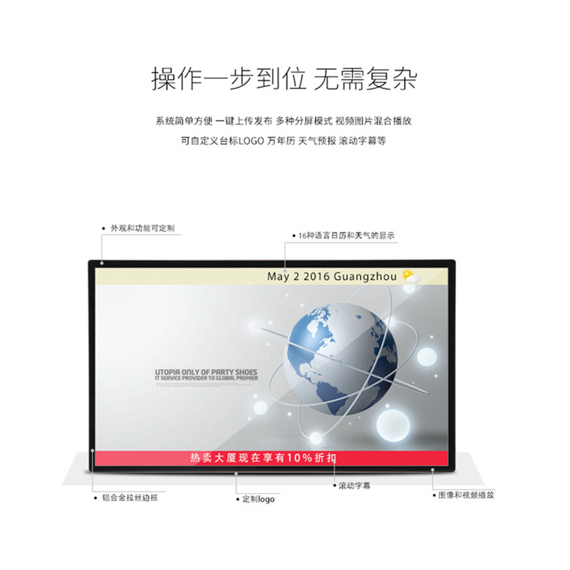 商贸业 酒店大堂,旅游景区,时尚旗舰店及专卖店新品推介产品展示;购物中心导购、商户和商品查询、广告推广;汽车4S店车款展示;电影院电影预告和片花欣赏。