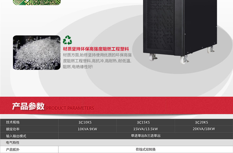 城堡系列新一代3C10KS ~ 3C20KS 传承上一代产品的优良品质,采用双转换纯在线式架构,外形美观,产品性能和产品可靠性大大提升。 对电网出现的断电、市电电压过高或过低、电压瞬间跌落或减幅震荡、 高压脉冲、电压波动、浪涌电压、谐波失真、杂波干扰、频率波动等状 况提供理想的解决方案,为用户负载提供安全可靠的电源保障。 城堡系列3C10KS ~ 3C20KS 是一款具有强大适应性、配置灵活的产品,采用先进的DSP数字控制技术,提供了非常丰富的可扩展功能, 用户可以根据需要灵活配置。