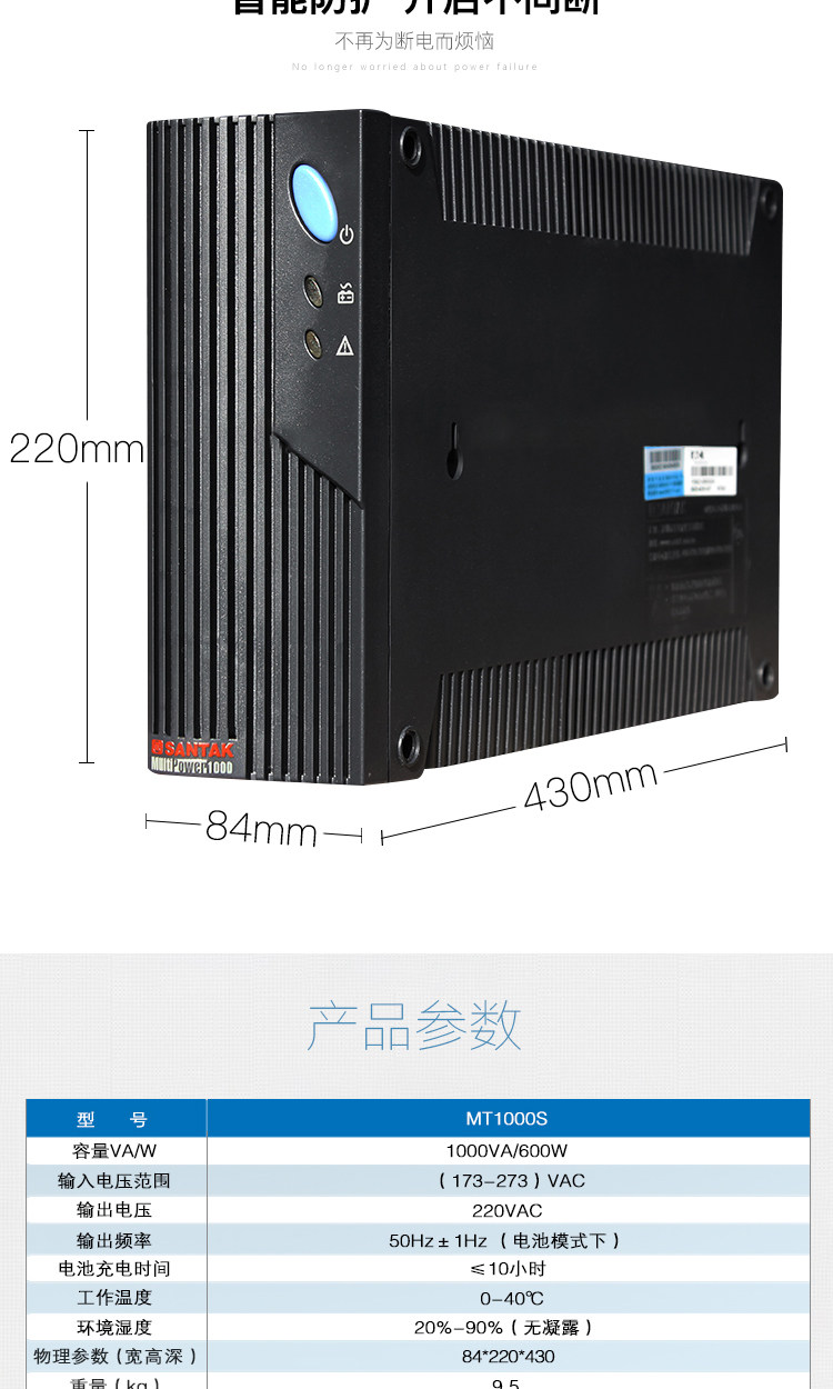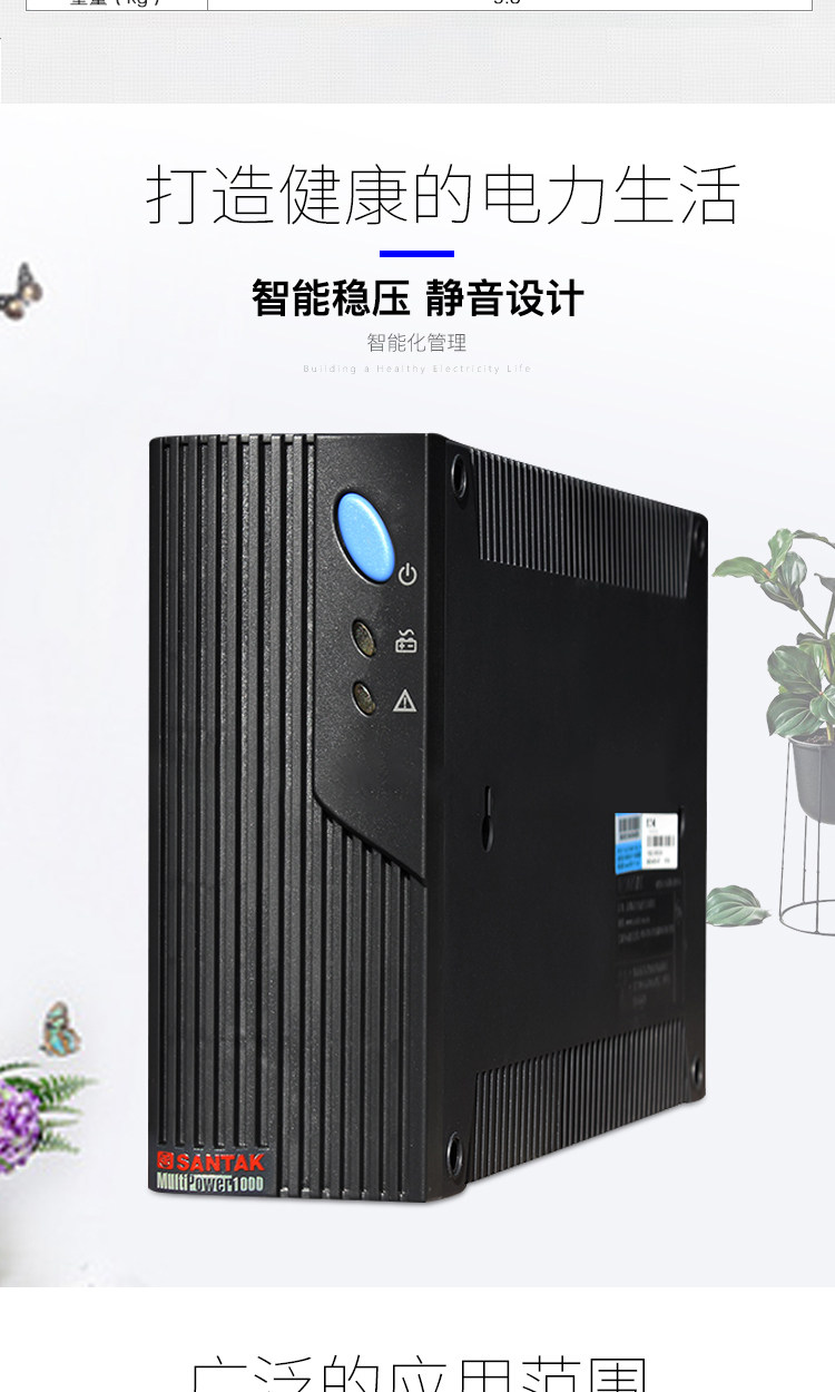 产品简介编辑山特 MT1000S-pro UPS:独立的稳压输出插座可外接打印机或扫描仪等电脑外设,避免了复杂的外部连线,同时可对设备进行突波保护。山特 MT1000S-pro UPS:网络保护端口:RJ45/RJ11;通讯端口:DB-9P。主要参数编辑工作方式 后备式 额定容量(KVA) 1