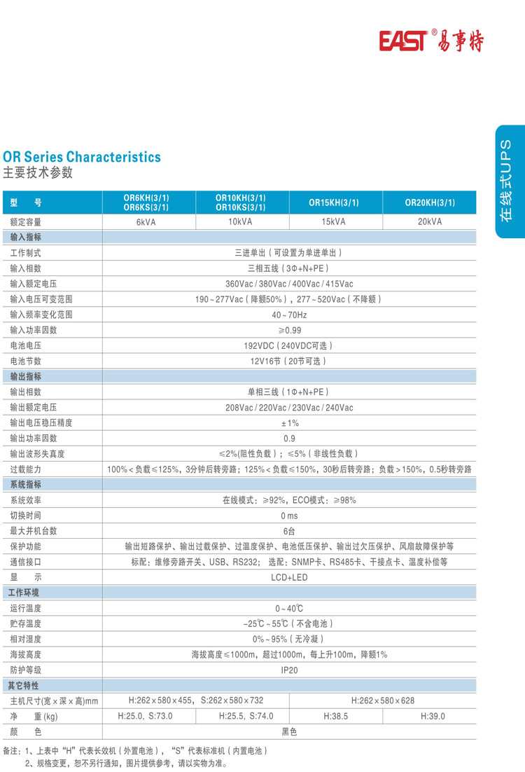 易事特EA900系列10kVA-30kVA(3/3) UPS是易事特集研发成果和应用经验,设计、制造的新一代通用型UPS电源,采用先进的DSP数字化控制技术,有效提升了产品性能和系统可靠性,并实现更高功率密度的集成和小型化。此系列产品电气性能优异,软硬件保护功能完善,能适应不同的电网环境,可以为各种负载提供安全可靠的电源保障。