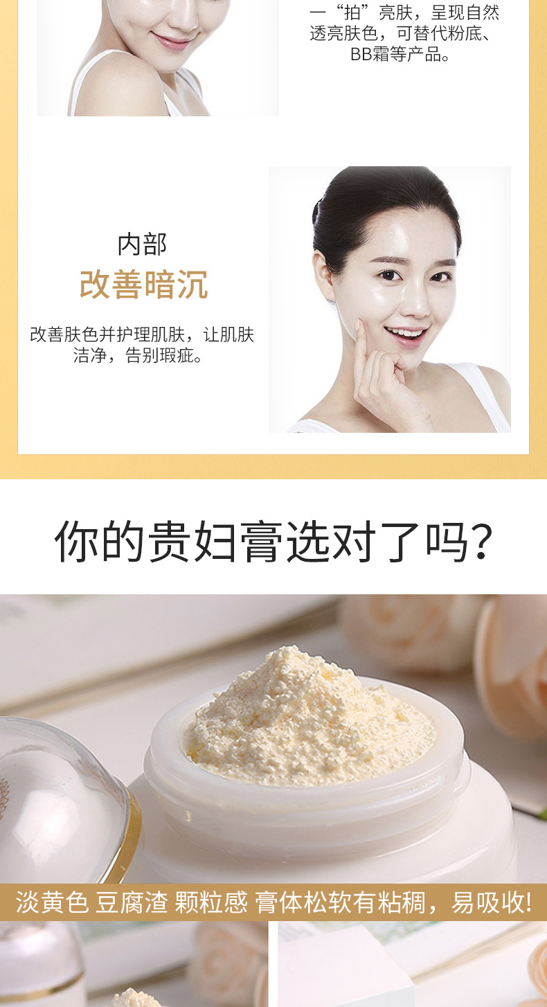贵妇膏具有美白去黄、淡斑、去黄、淡化痘等功效。